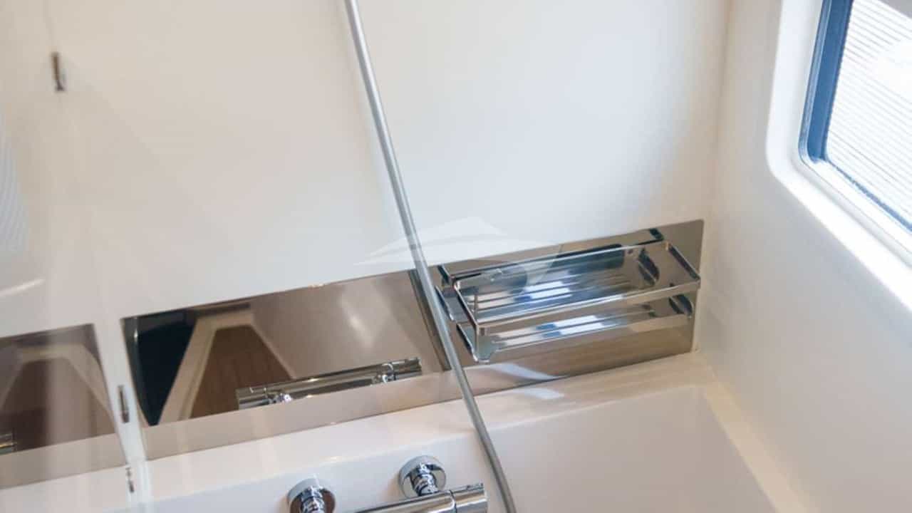 As comodidades a bordo para os hóspedes charter incluem ar-condicionado, chuveiro externo, sistema de áudio interno, dock para iPod e plataforma de natação.