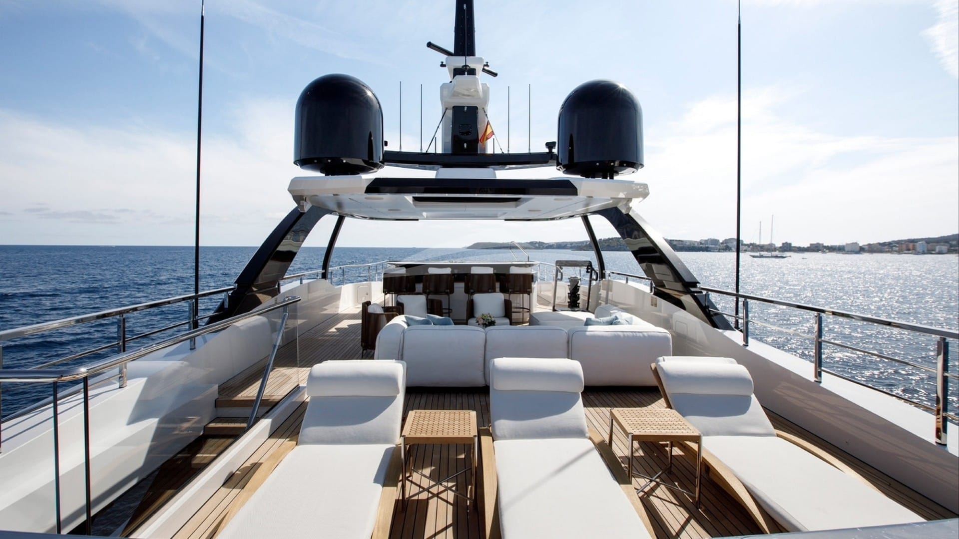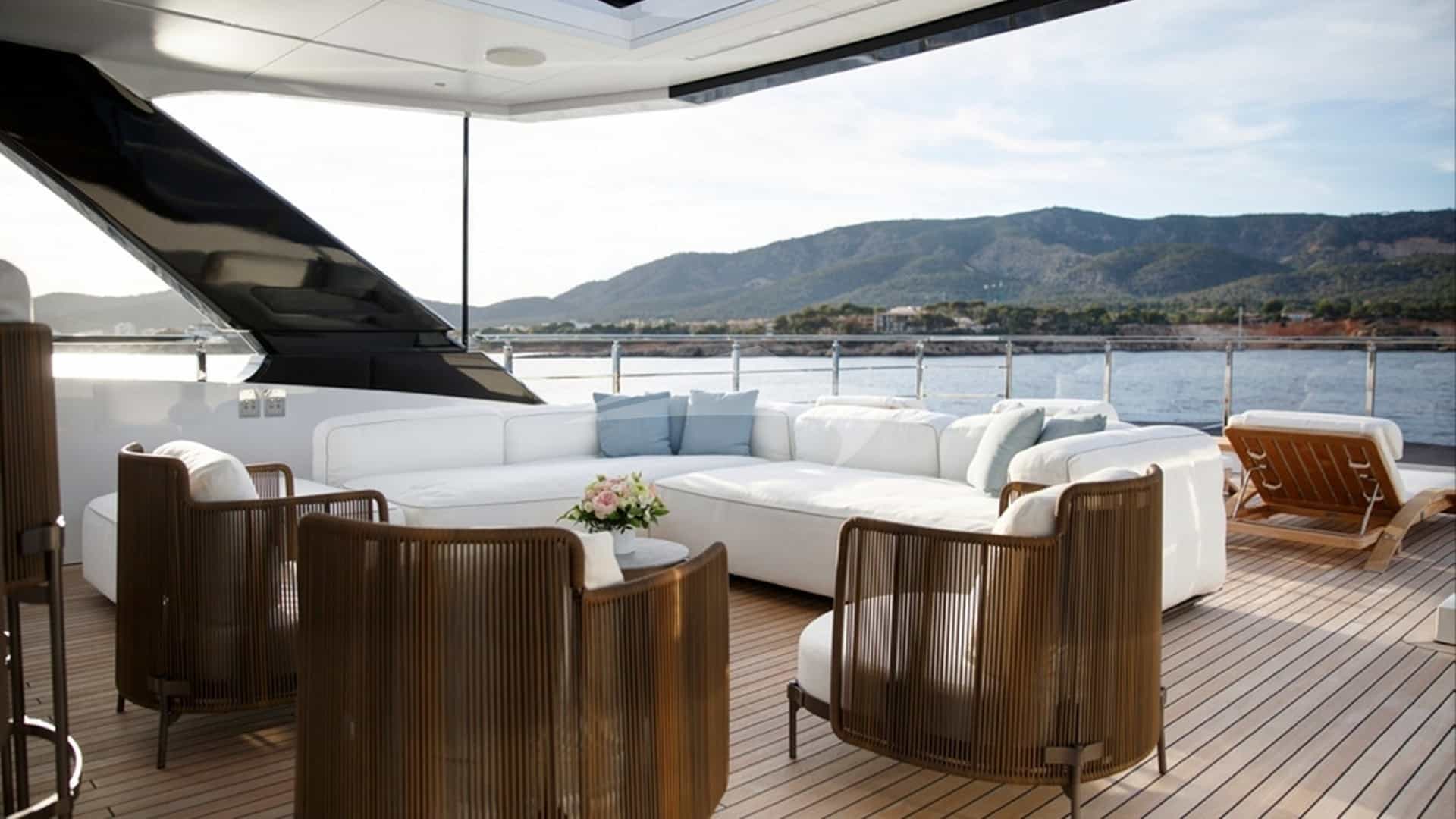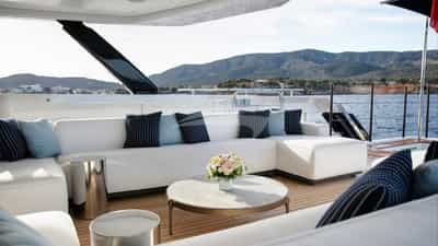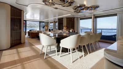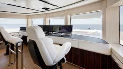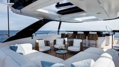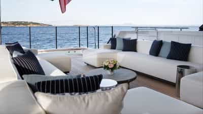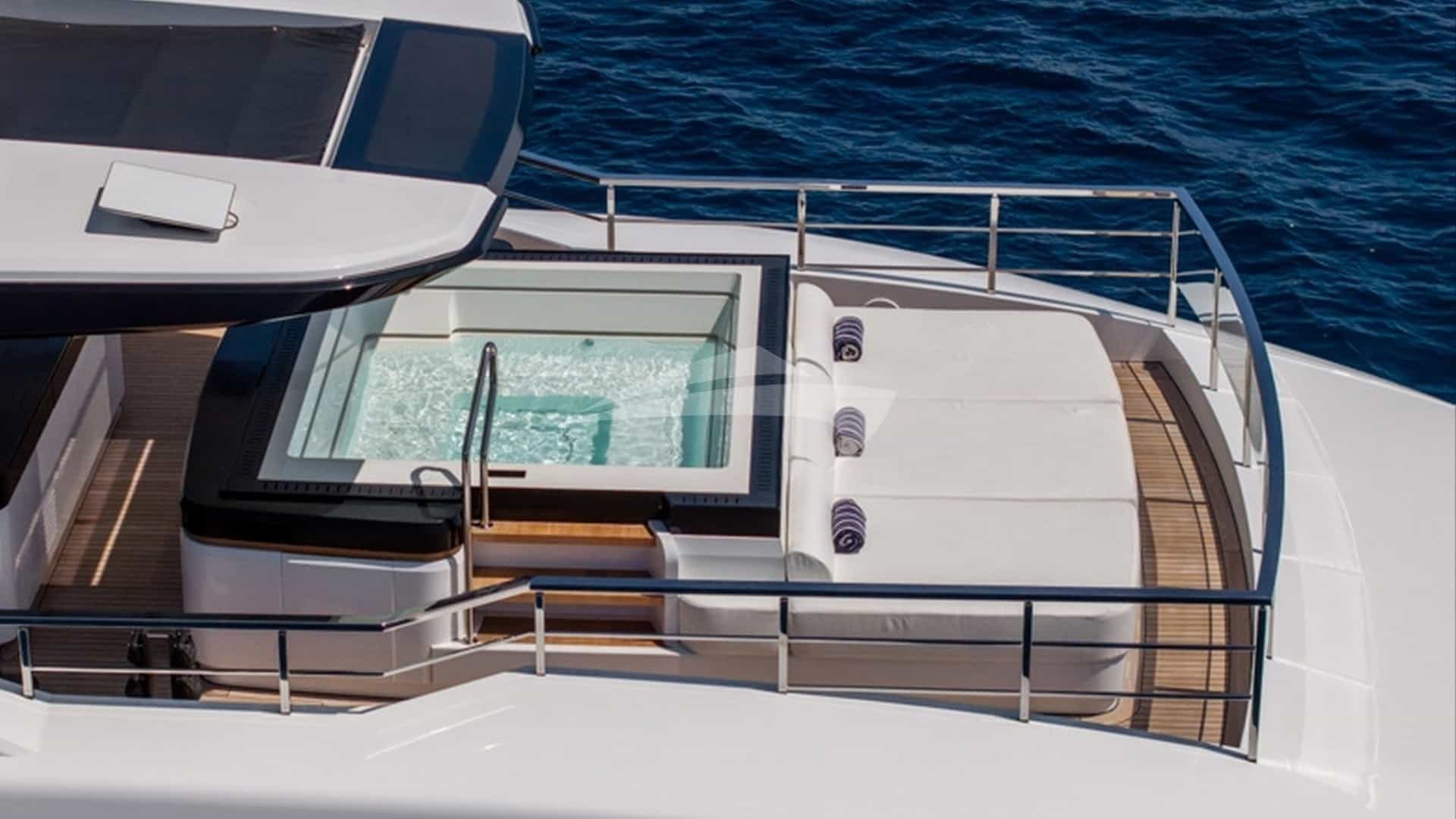 As comodidades a bordo para os hóspedes charter incluem ar condicionado, clube de praia, jacuzzi no convés, estabilizadores e Wi-Fi.