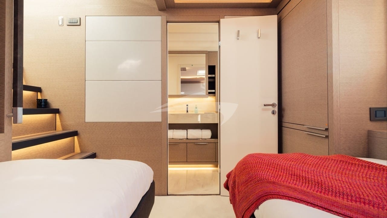 As cabines de hóspedes compreendem uma suíte principal com cama king size e banheiro privativo localizado no andar inferior, uma cabine com cama queen size e banheiro privativo e 2 cabines com cama queen size e banheiro privativo.