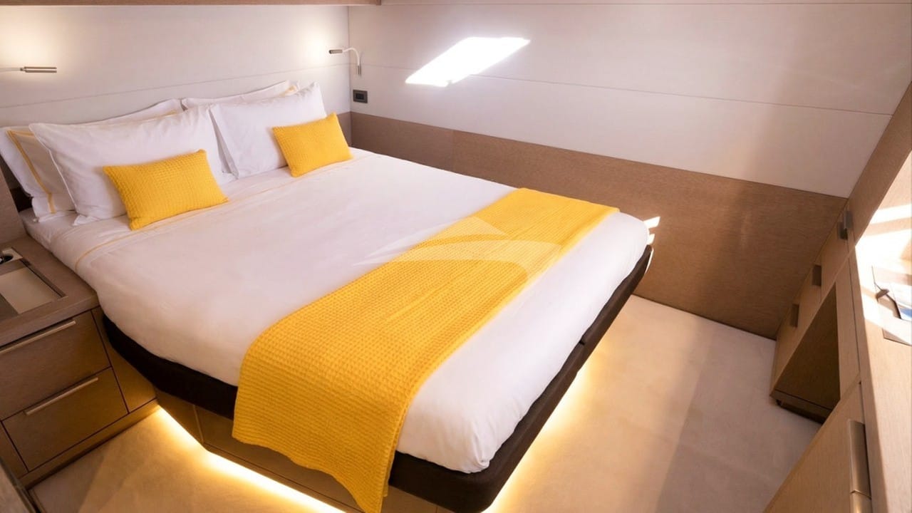 REVA NUI pode acomodar 8 hóspedes dormindo a bordo em 4 cabines, com capacidade de cruzeiro com até 8 convidadas.