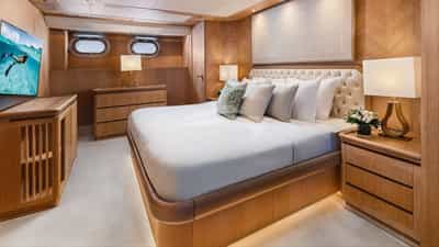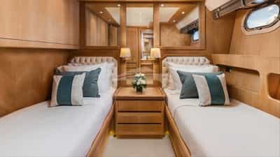 As cabines de hóspedes incluem uma suíte principal com uma cama king size e banheiro privativo, 2 cabines com cama de casal e banheiro privativo e 2 cabines com cama de solteiro e banheiro privativo.