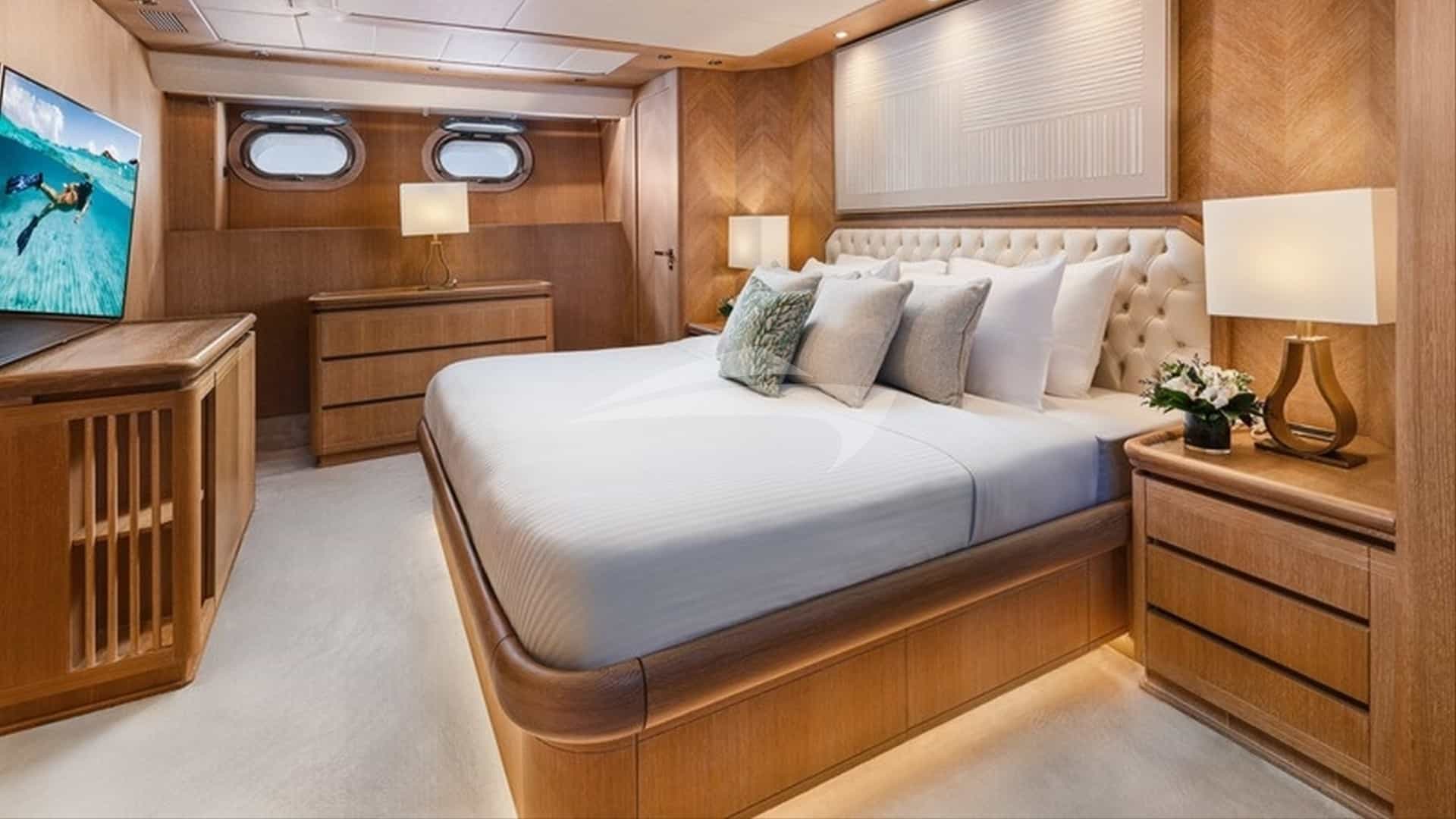 As comodidades a bordo para os hóspedes charter incluem ar condicionado, equipamento de pesca leve, estabilizadores e Wi-Fi.