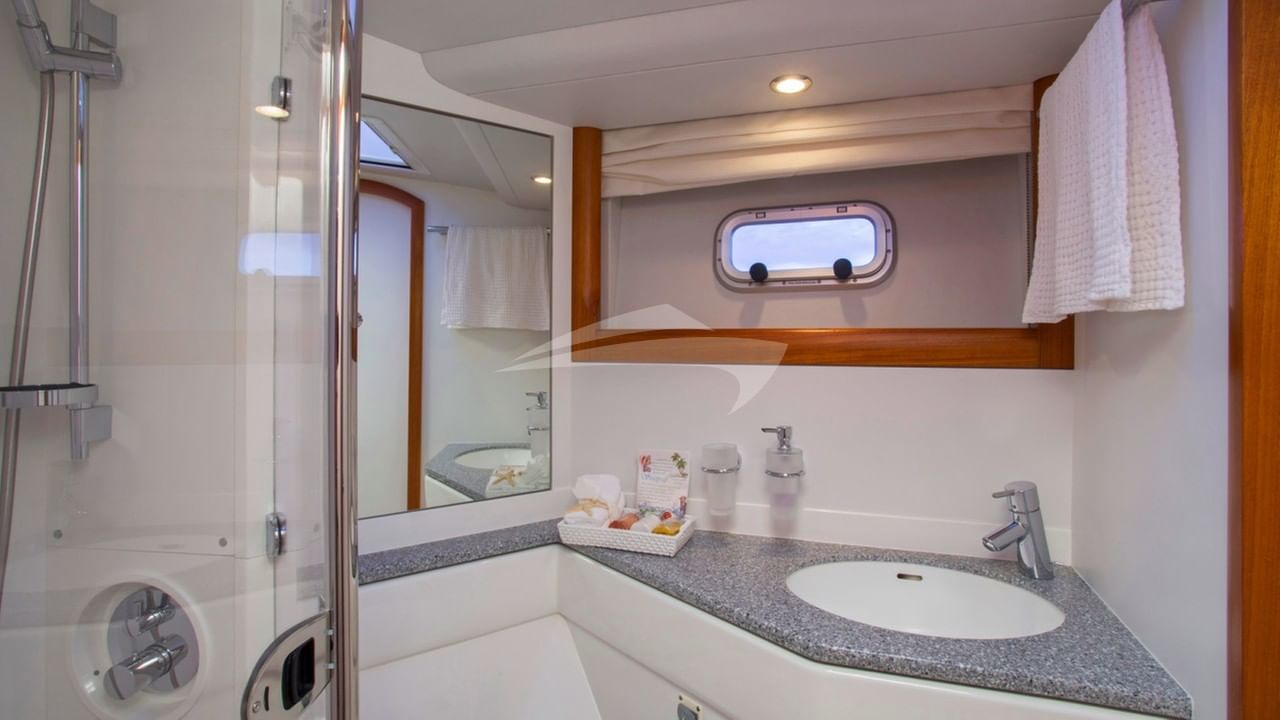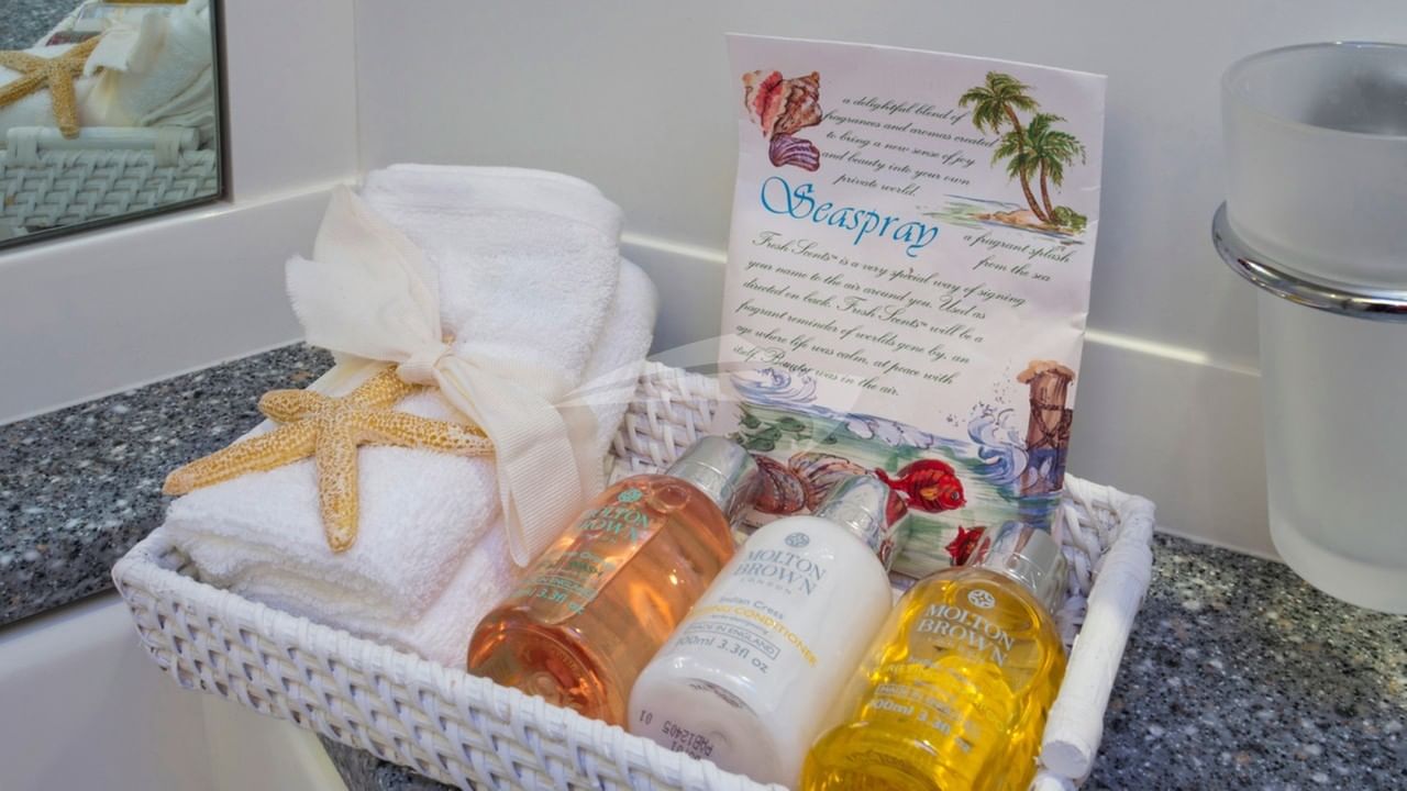 As comodidades a bordo incluem ar condicionado, biblioteca, chuveiro externo, equipamento de pesca leve, sistema de áudio interno, TV local, sistema de áudio externo, impressora, comunicações via satélite, protetores solares, plataforma de natação, TV em todas as cabines, salão de TV e Wi-Fi.