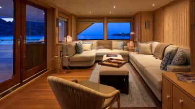 O ANCALLIA foi projetado para acomodar confortavelmente até 12 hóspedes charter em 7 suítes.