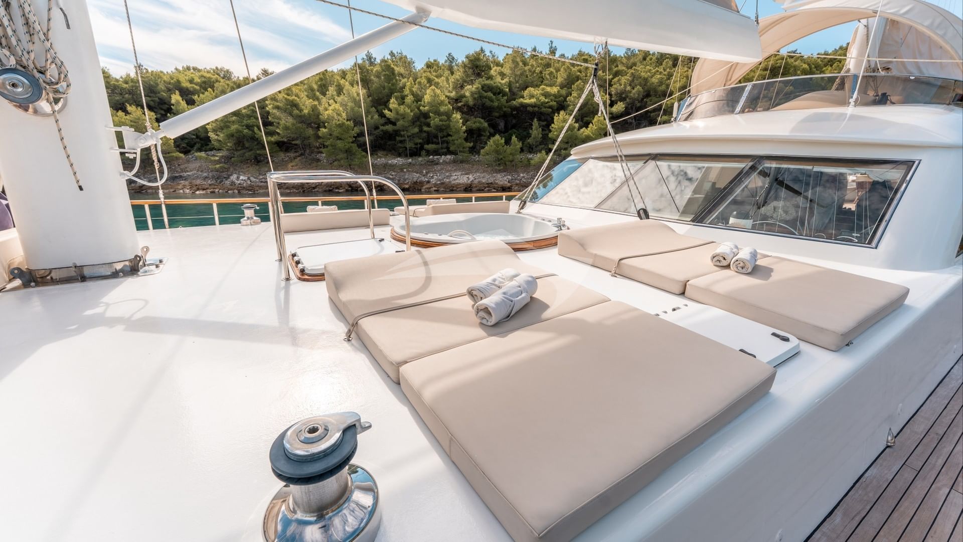 As comodidades a bordo para os hóspedes charter incluem ar condicionado, assentos no convés, jacuzzi no convés e Wi-Fi.