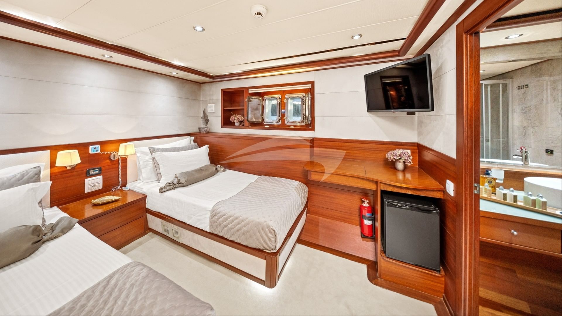 As cabines de hóspedes incluem uma suíte principal com cama de casal e banheiro privativo, 3 cabines com cama de casal e banheiro privativo e uma cabine com cama de solteiro e banheiro privativo.