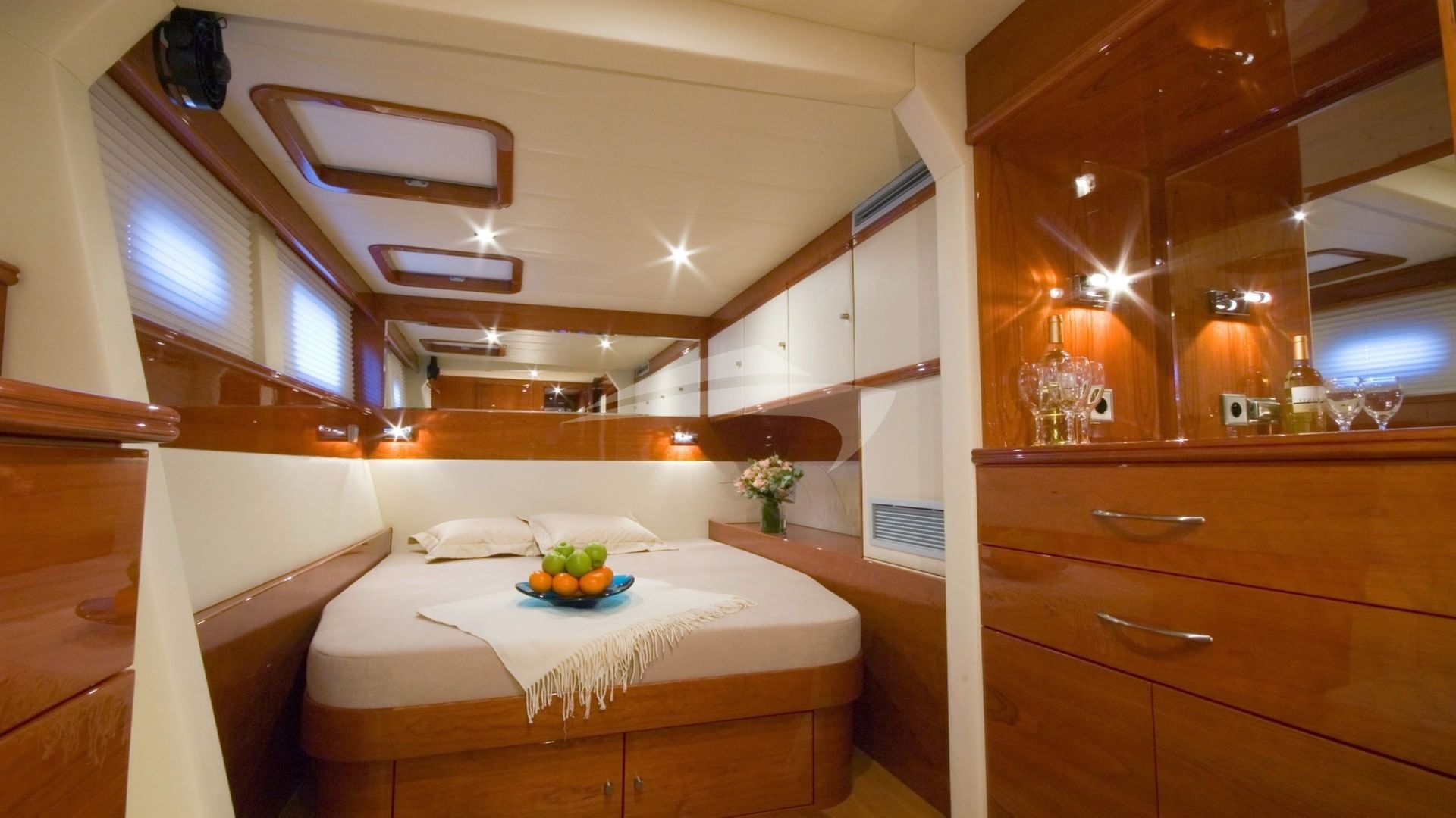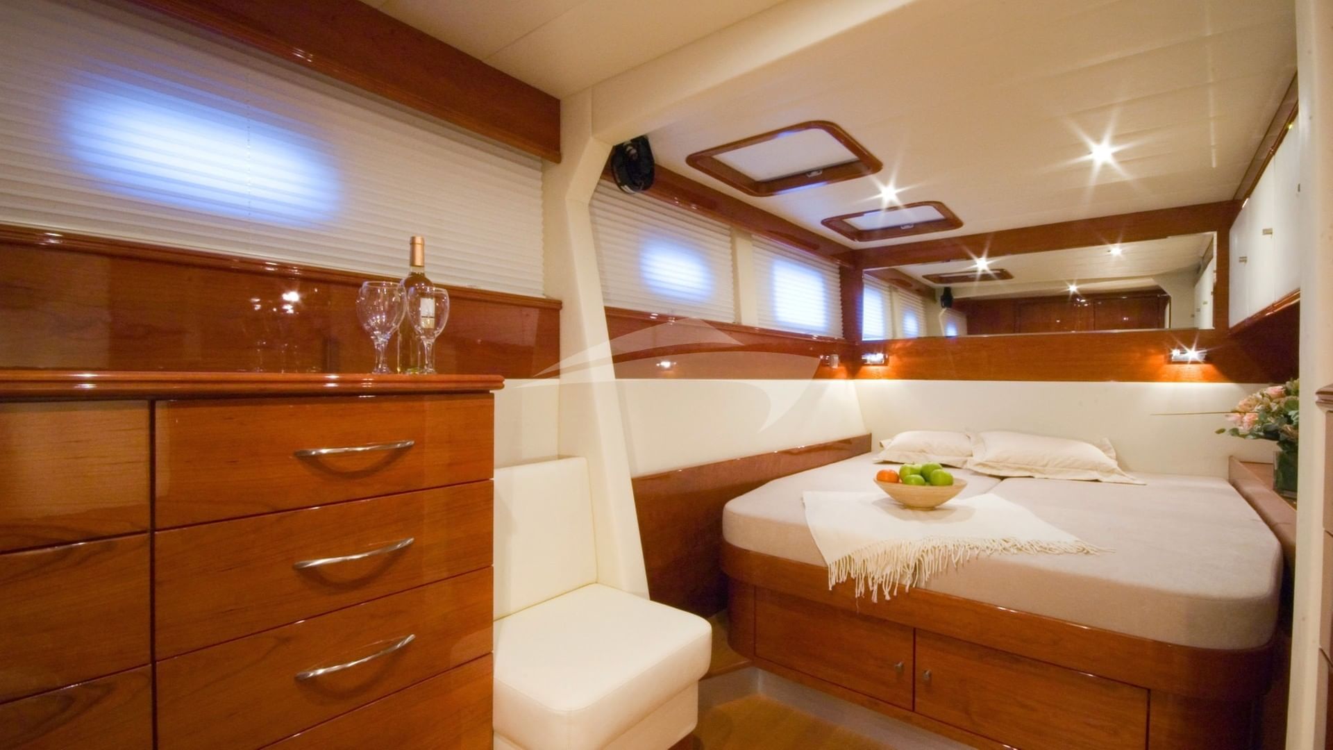 O BLAZE II pode acomodar 8 pessoas em 4 cabines constituídas por uma suíte primária com cama de casal e banheiro privativo e 3 cabines com cama de casal e banheiro privativo.
