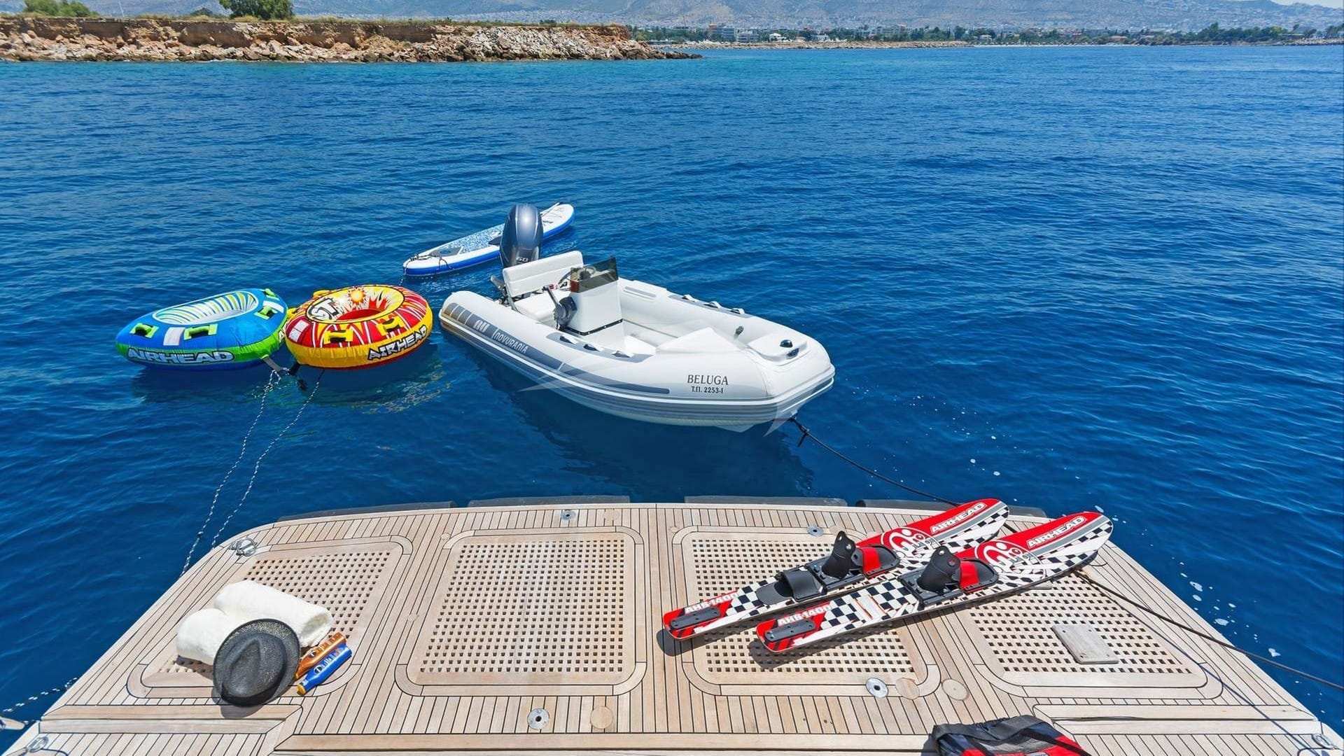 As comodidades a bordo incluem ar condicionado, churrasqueira, equipamento de pesca leve, almofadas de sol, plataforma de natação e Wi-Fi.