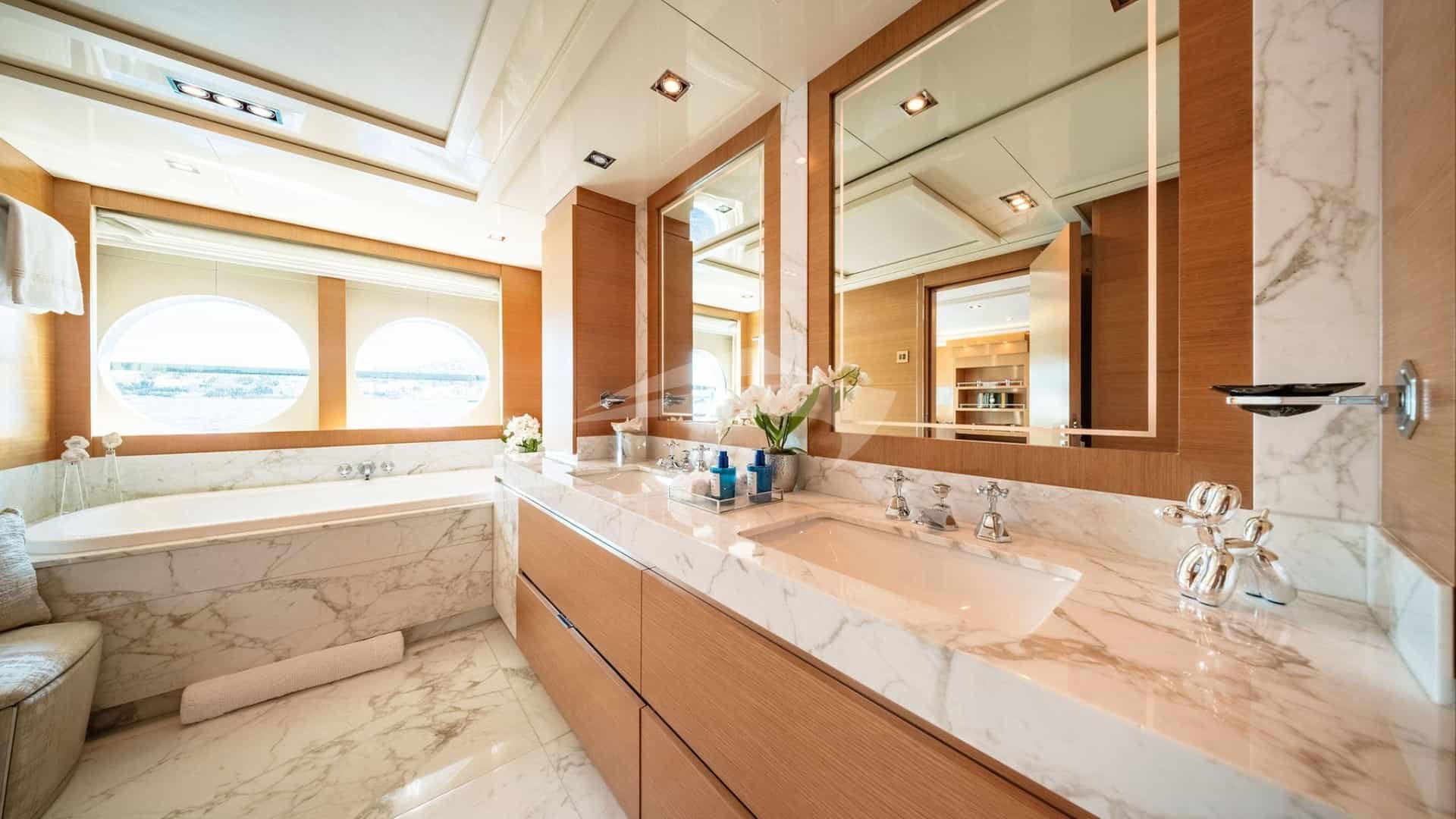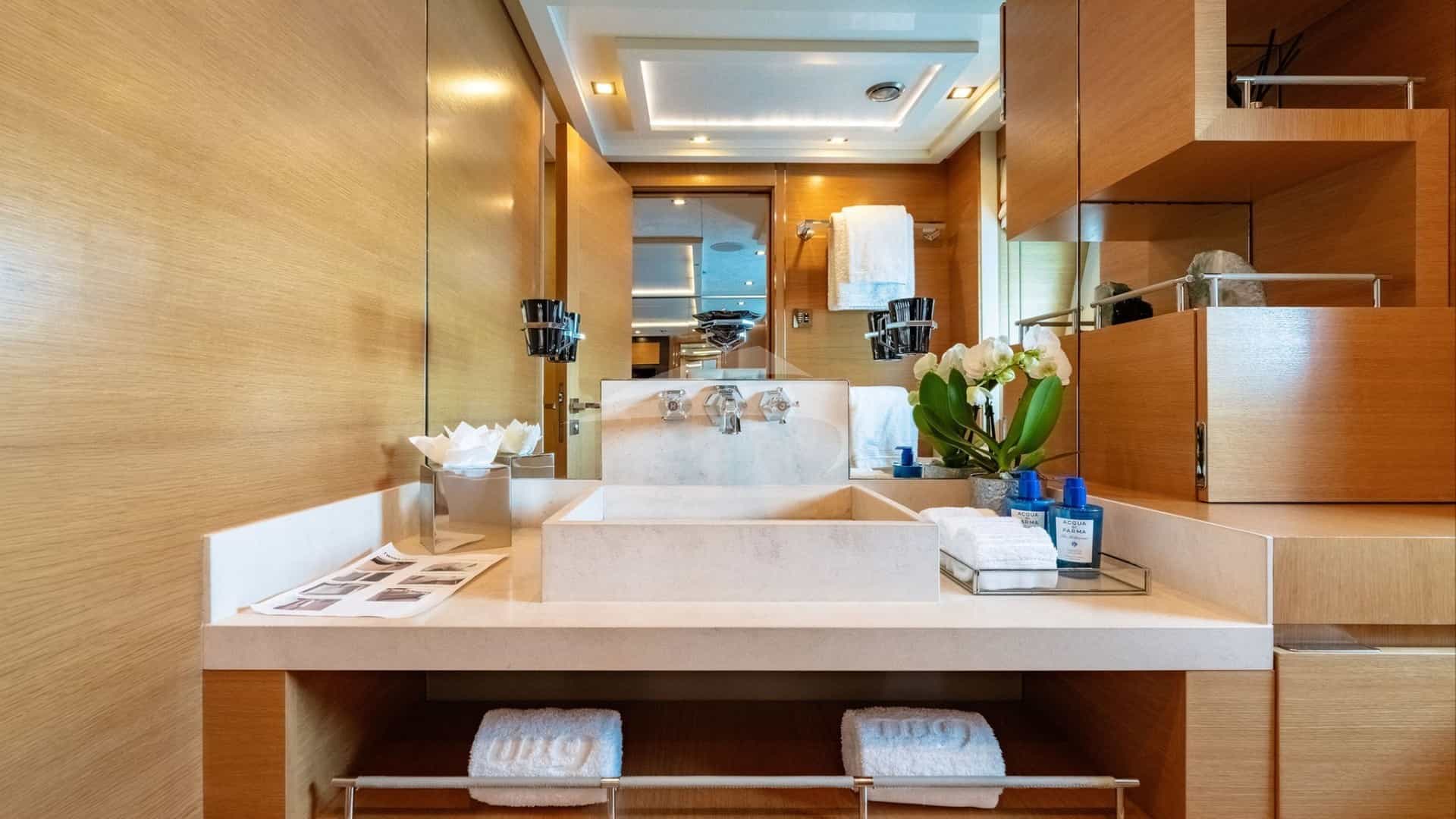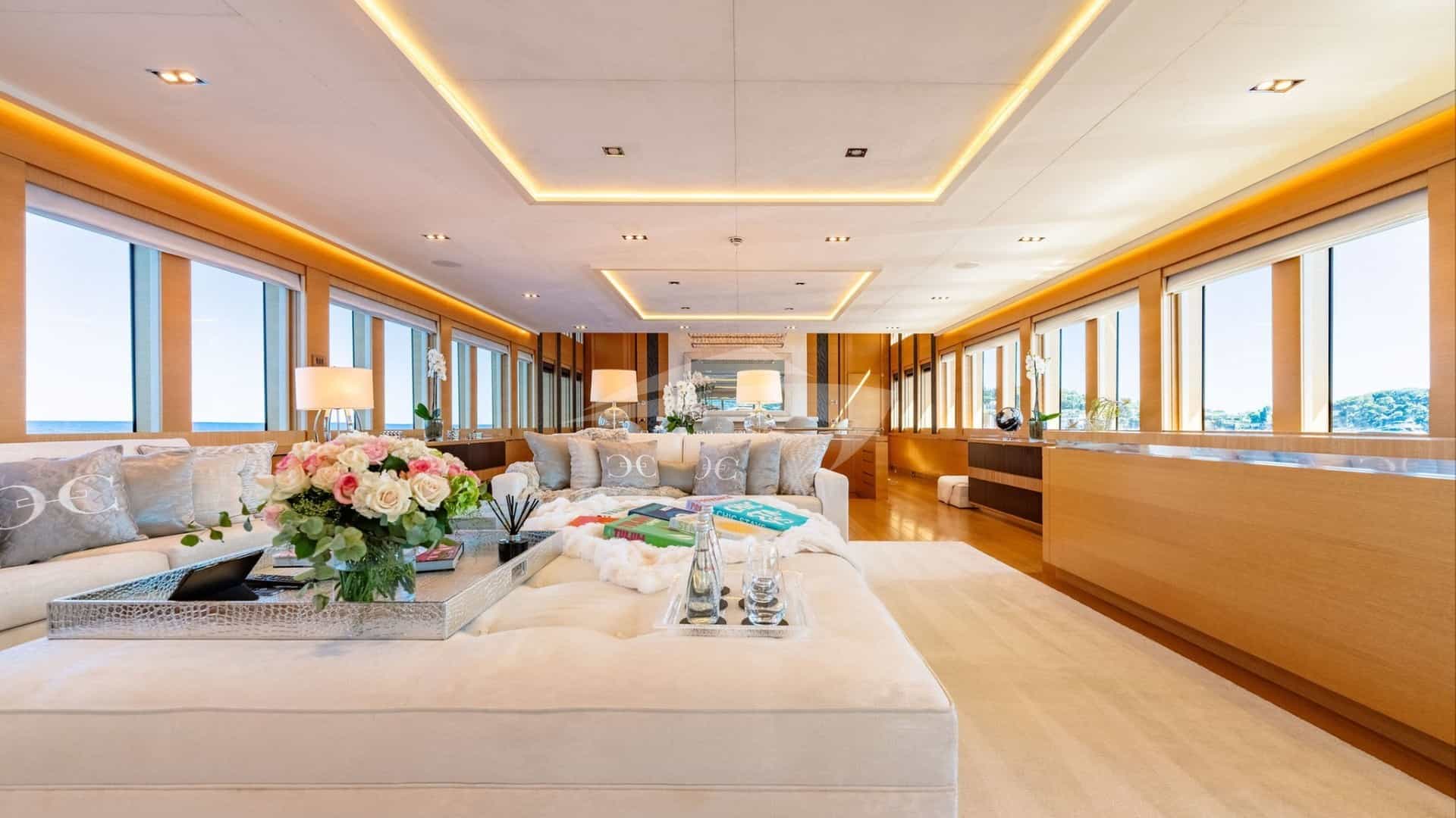 As comodidades a bordo para os hóspedes charter incluem ar condicionado, churrasqueira, equipamento de ginástica, equipamento de pesca leve, academia, jacuzzi no convés, sistema de áudio externo, estabilizadores ancorados, almofadas de sol, espreguiçadeiras, plataforma de natação, piscina, TV em todas as cabines, TV externa e Wi-Fi.