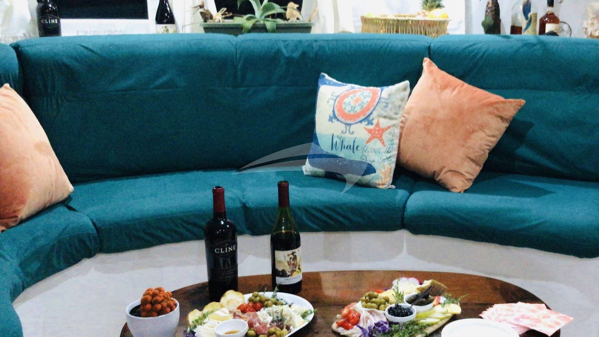 As comodidades a bordo incluem churrasqueira, chuveiro externo, sistema de áudio interno, dock para iPod, plataforma Swim, sala de TV e Wi-Fi.