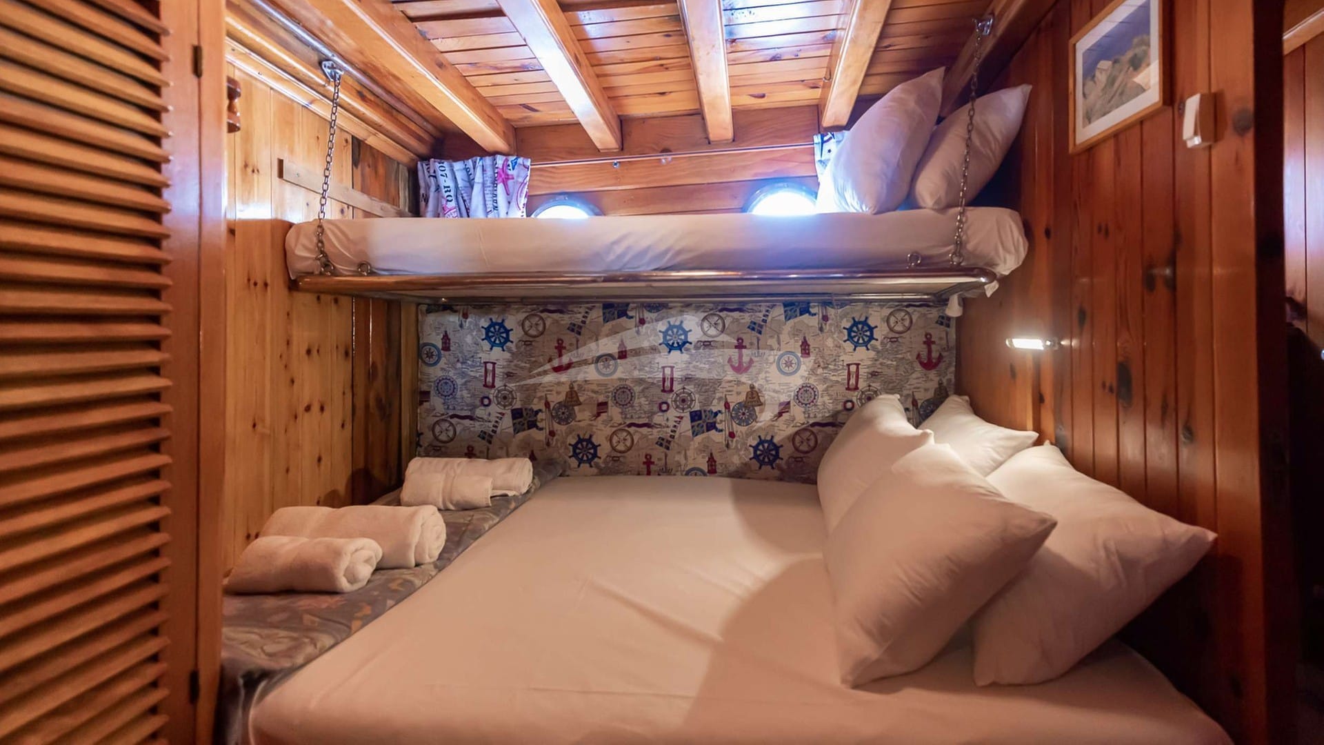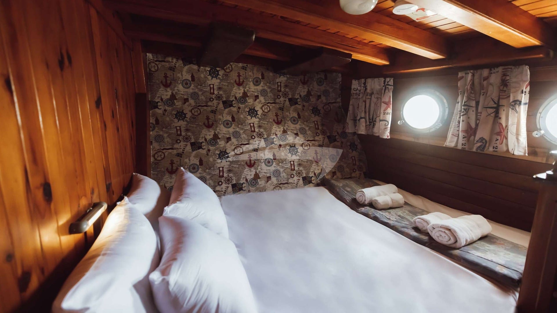 Гостевые каюты состоят из основного люкса с двуспальной кроватью и ванной комнатой, а также 7 кают с двуспальной кроватью и собственной ванной комнатой.