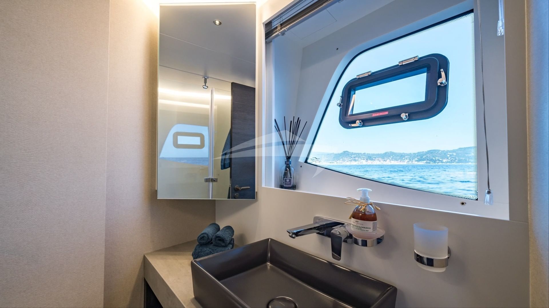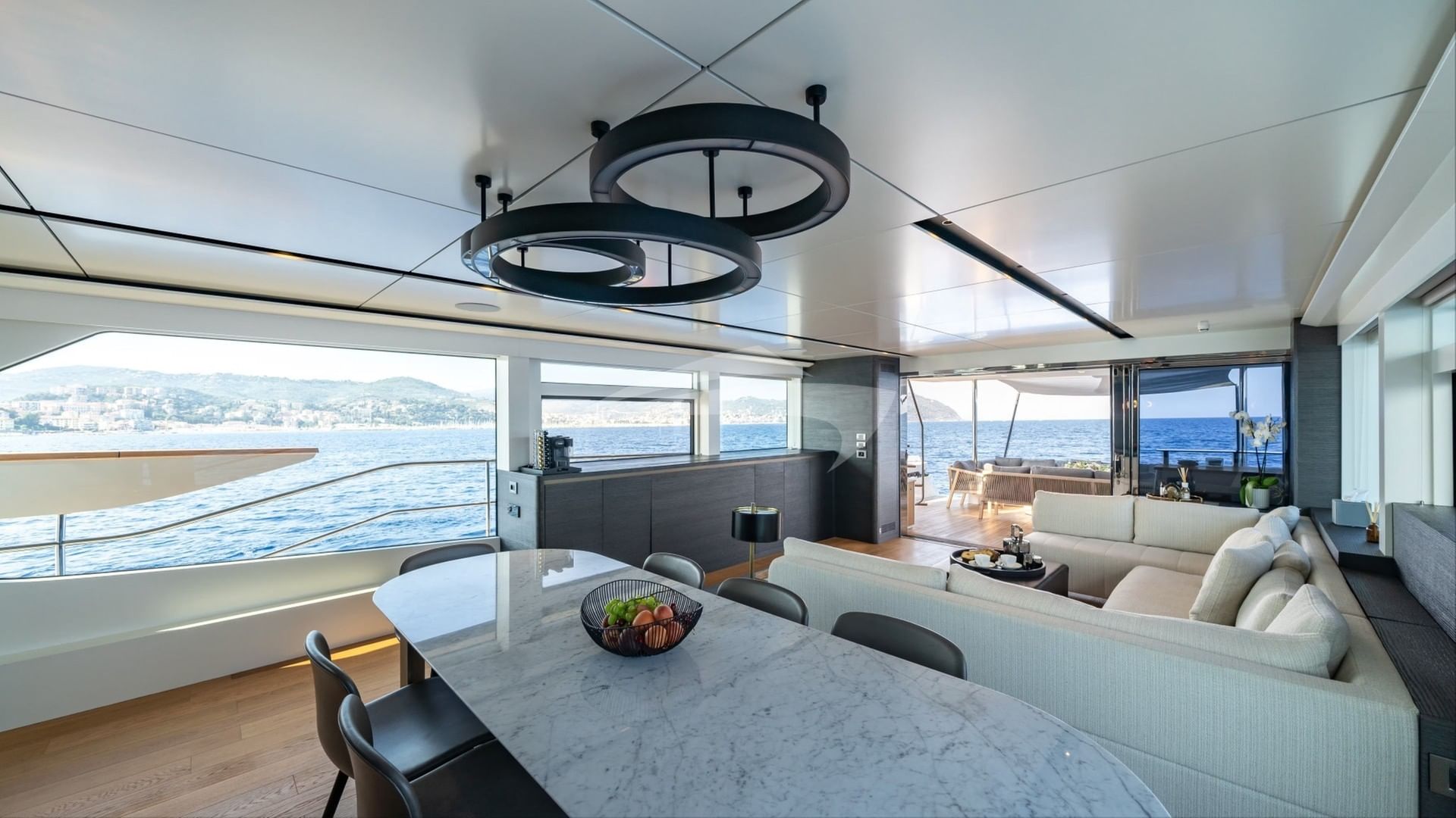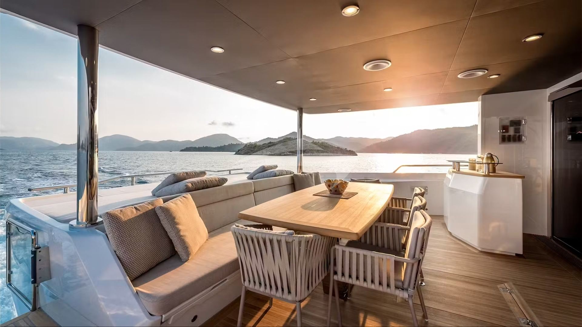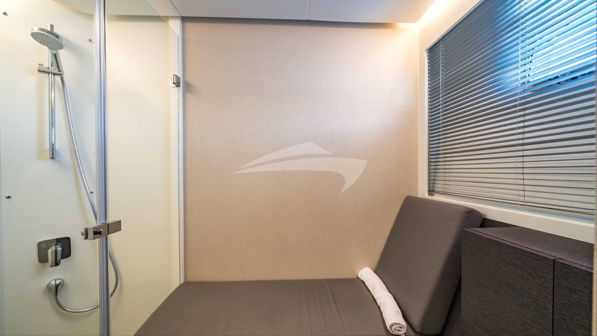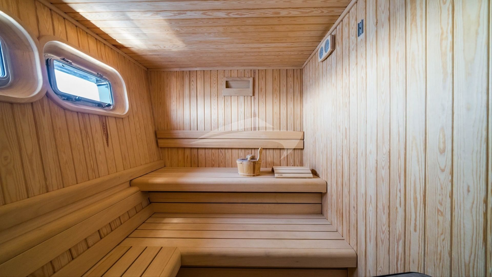 Удобства на борту для чартерных гостей включают кондиционер, сауну, стабилизаторы на якоре, шезлонги, платформу для купания и Wi-Fi.