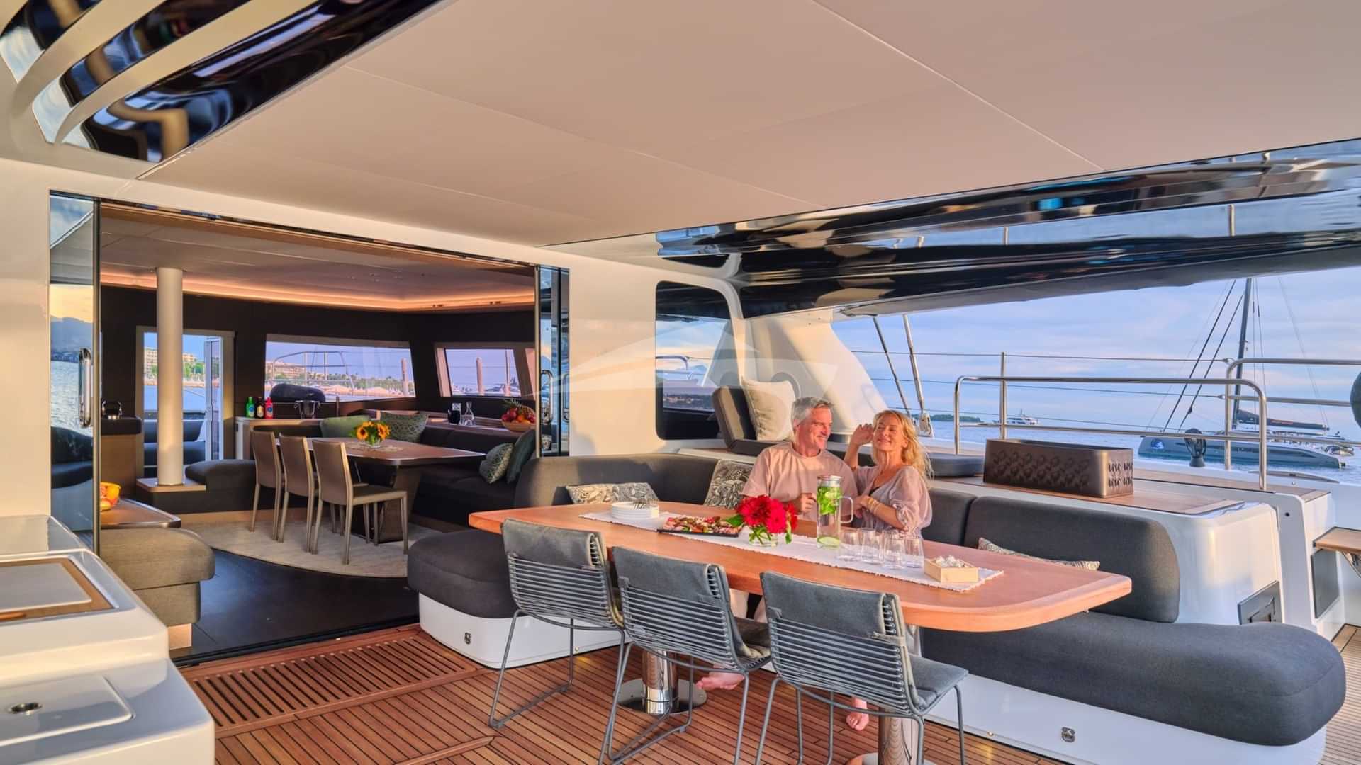 Удобства на борту для чартерных гостей включают кондиционер, кофемашину, сиденья на носовой палубе, столик для сидения на носовой палубе, тренажерный зал, спутниковый доступ в Интернет Starlink, шезлонги, платформу для купания, ТВ-салон, водонагреватель и Wi-Fi.