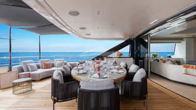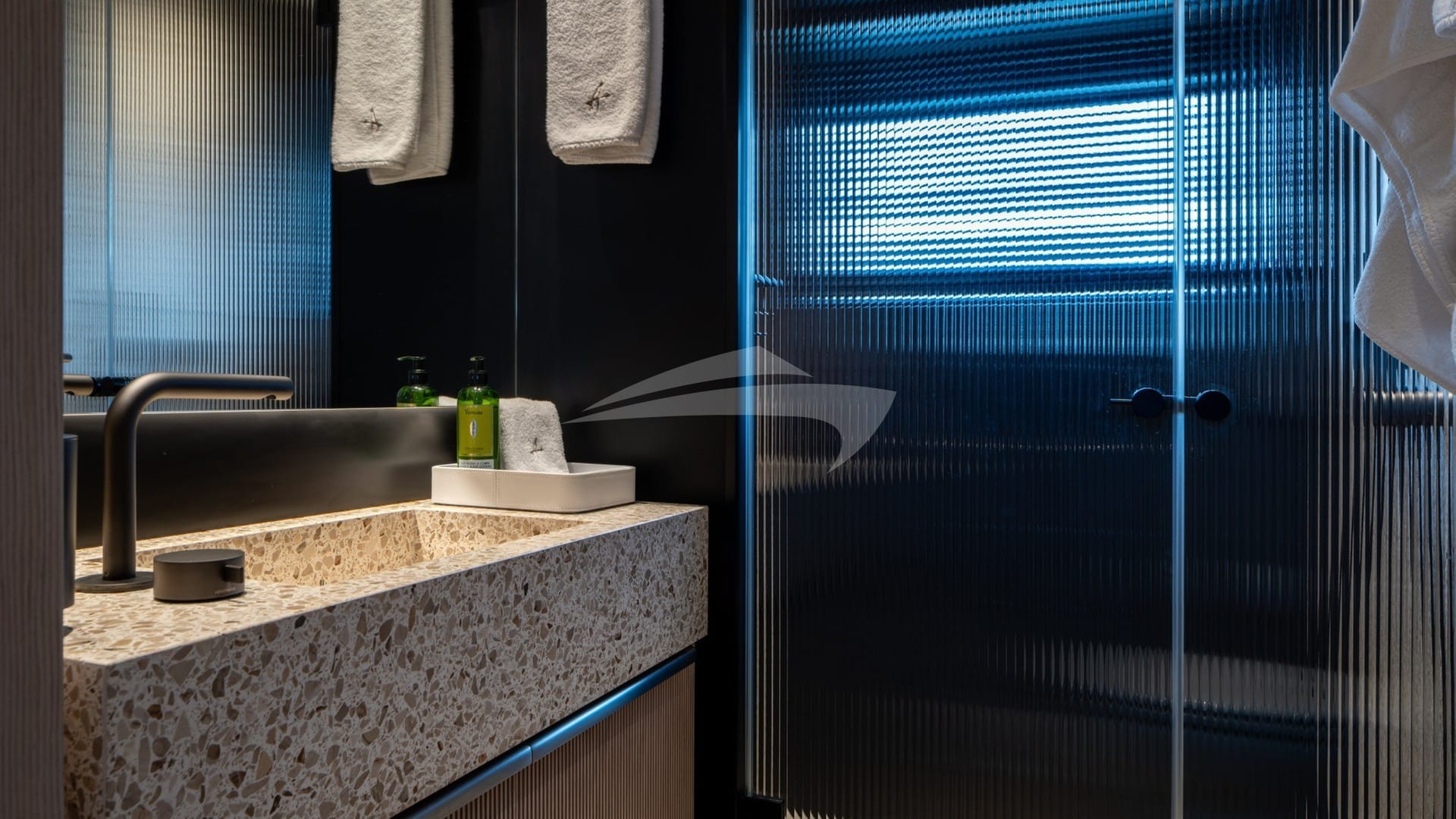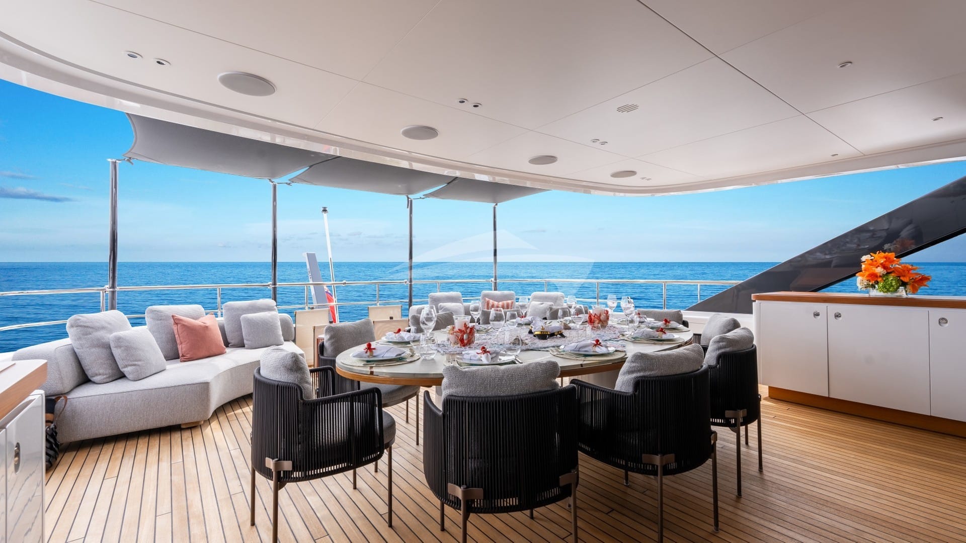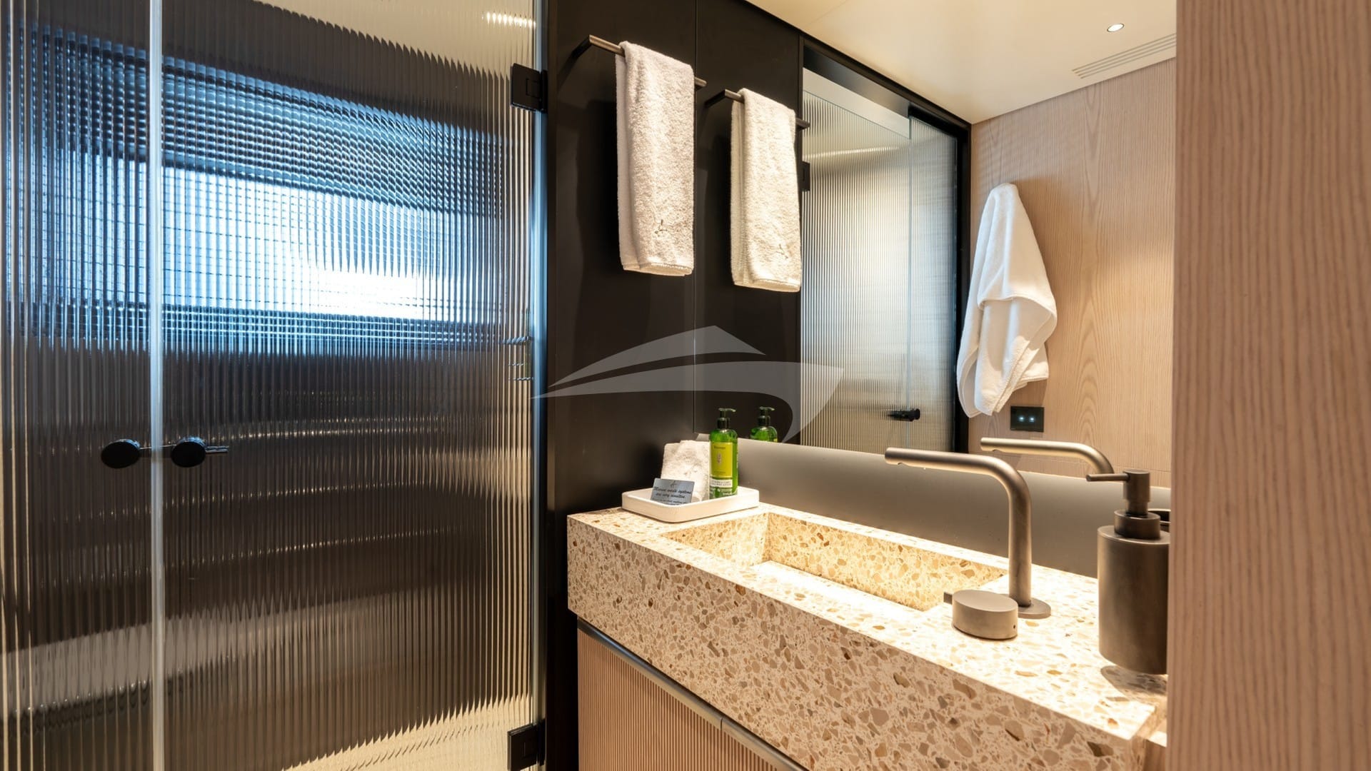Удобства на борту для чартерных гостей включают кондиционер, пляжный клуб, велосипеды, душ на открытом воздухе, тренажерный зал, тренажерный зал, джакузи на палубе, бар на открытом воздухе, стабилизаторы, стабилизаторы на якоре, шезлонги, солярий, платформу для купания, бассейн и Wi-Fi.