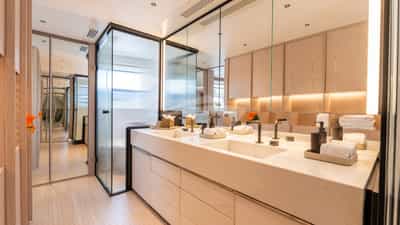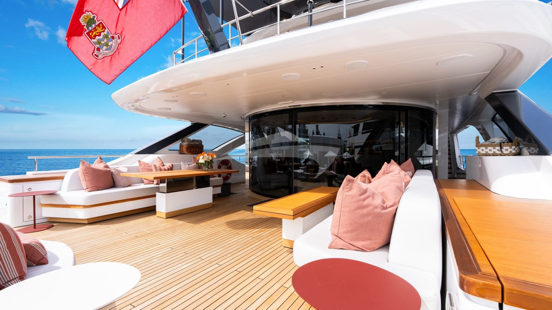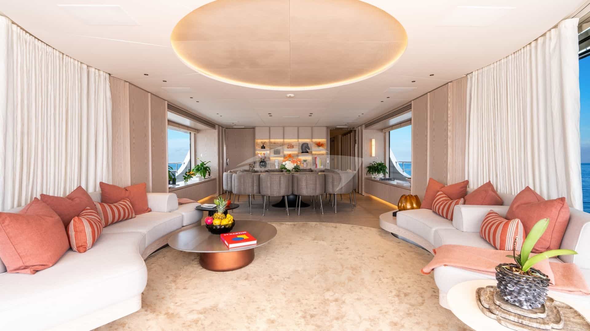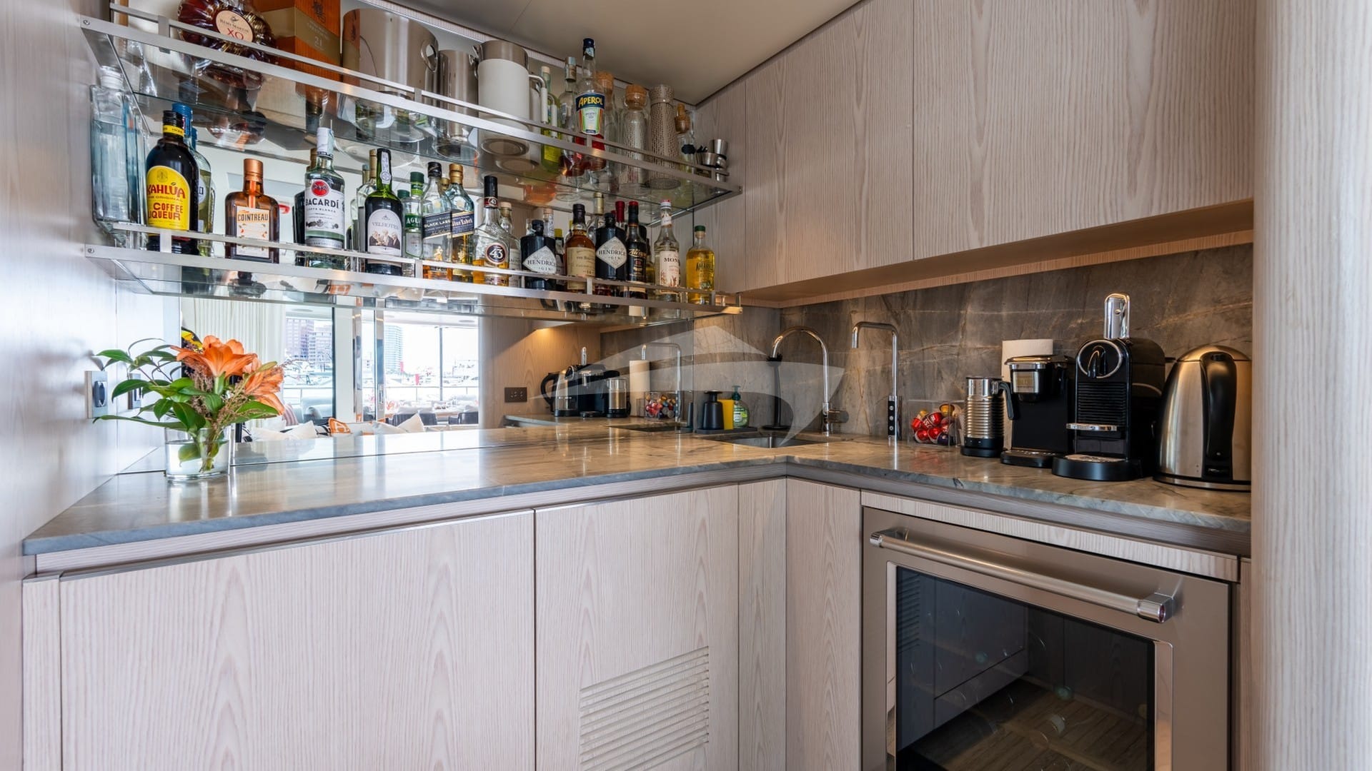 Удобства на борту для чартерных гостей включают кондиционер, пляжный клуб, велосипеды, душ на открытом воздухе, тренажерный зал, тренажерный зал, джакузи на палубе, бар на открытом воздухе, стабилизаторы, стабилизаторы на якоре, шезлонги, солярий, платформу для купания, бассейн и Wi-Fi.