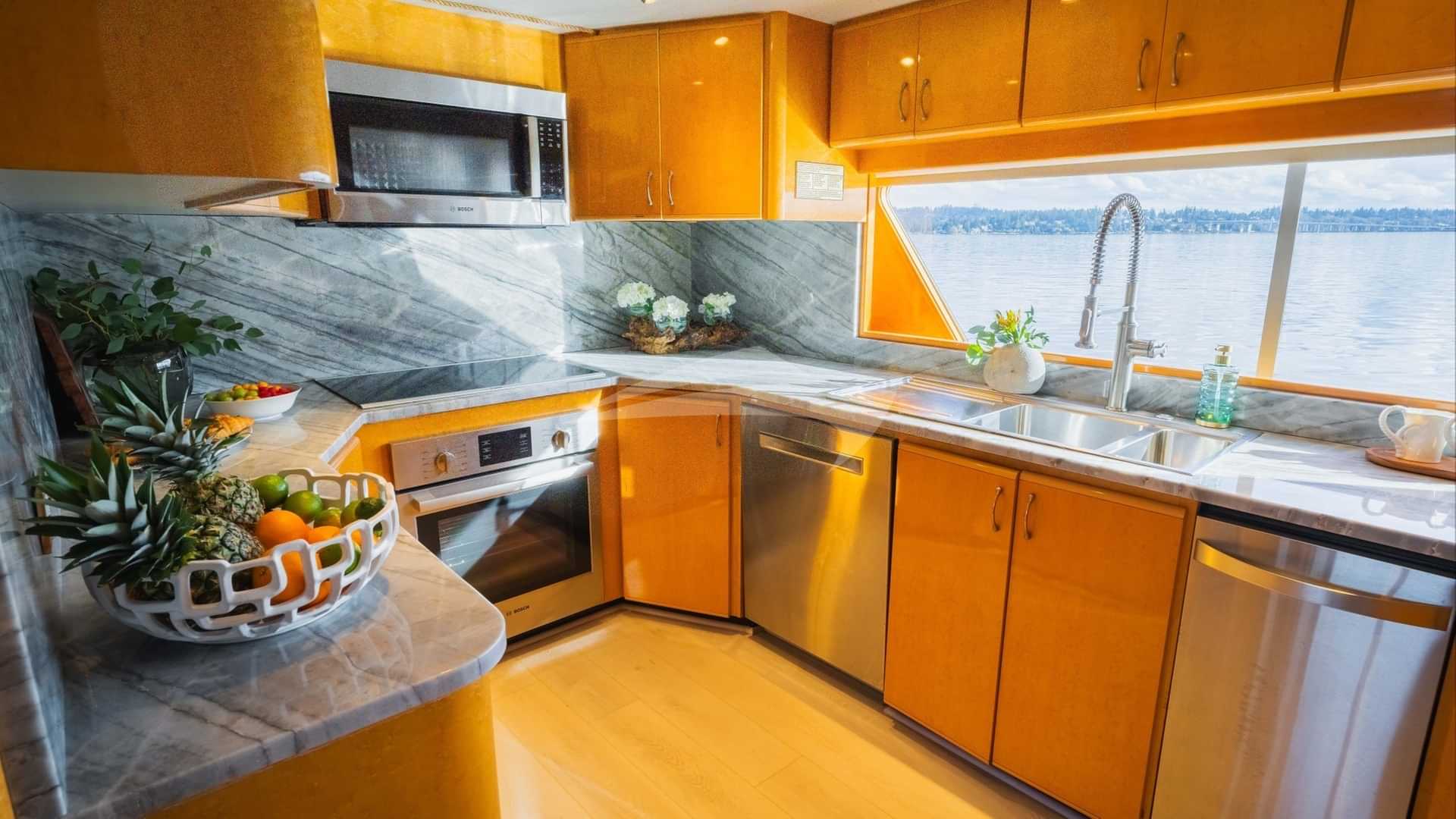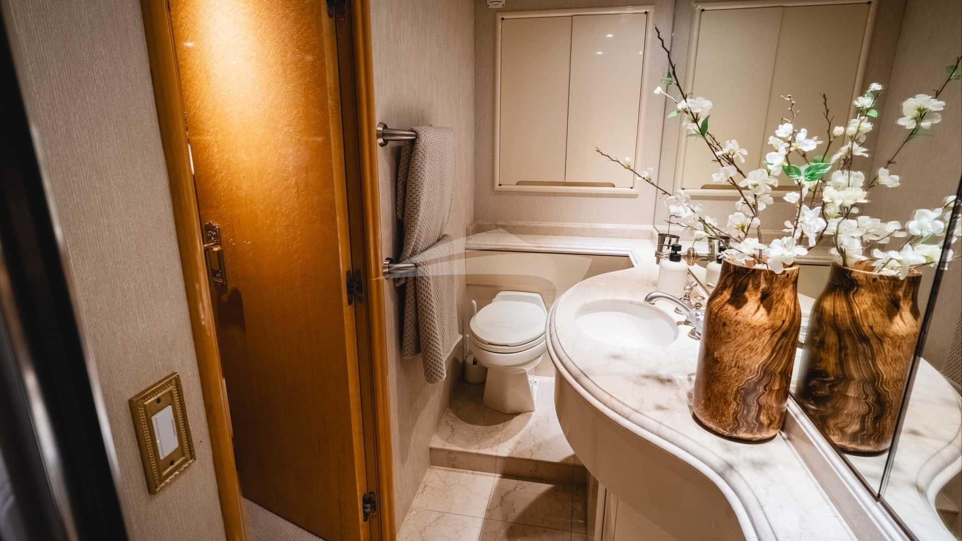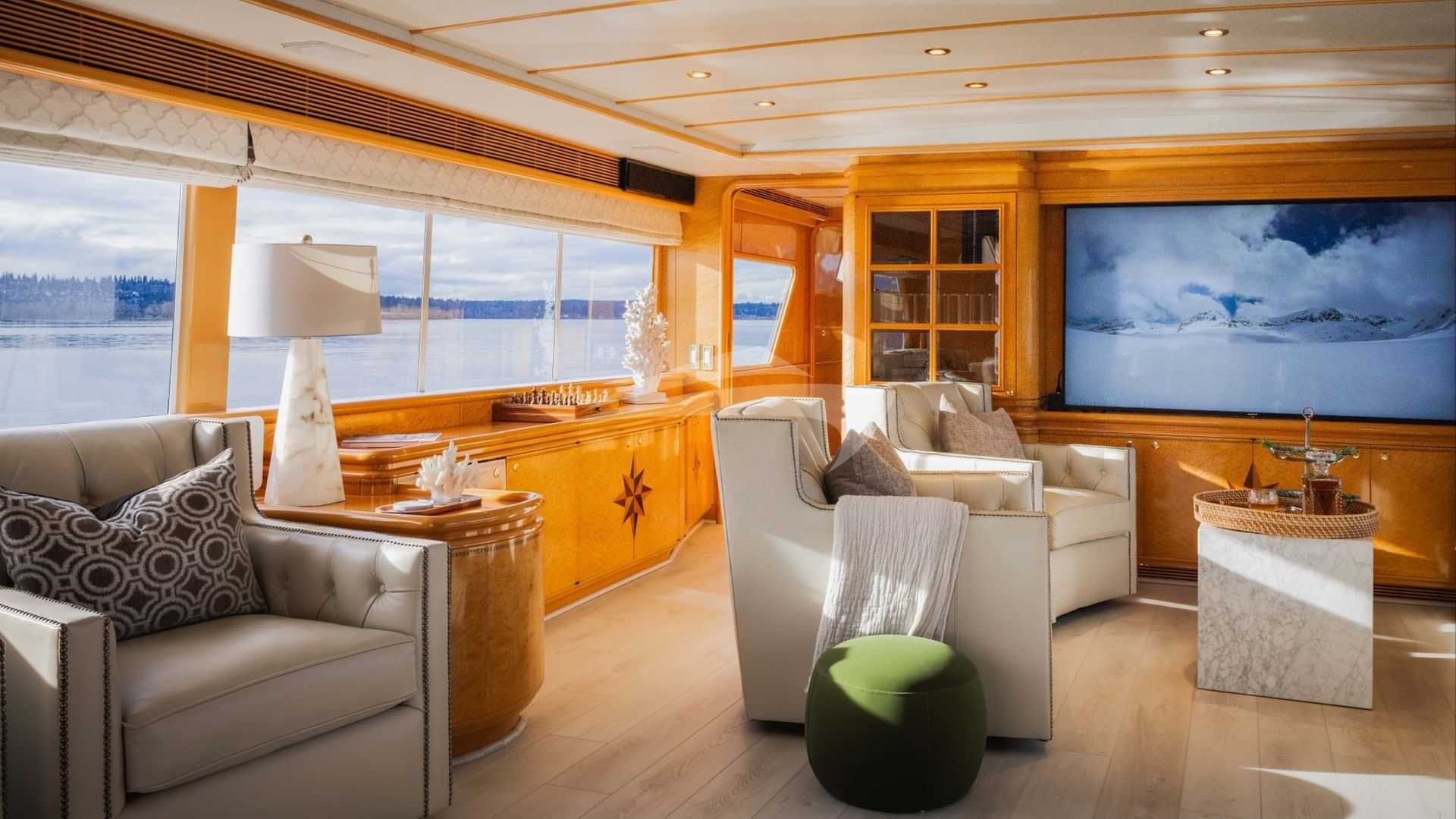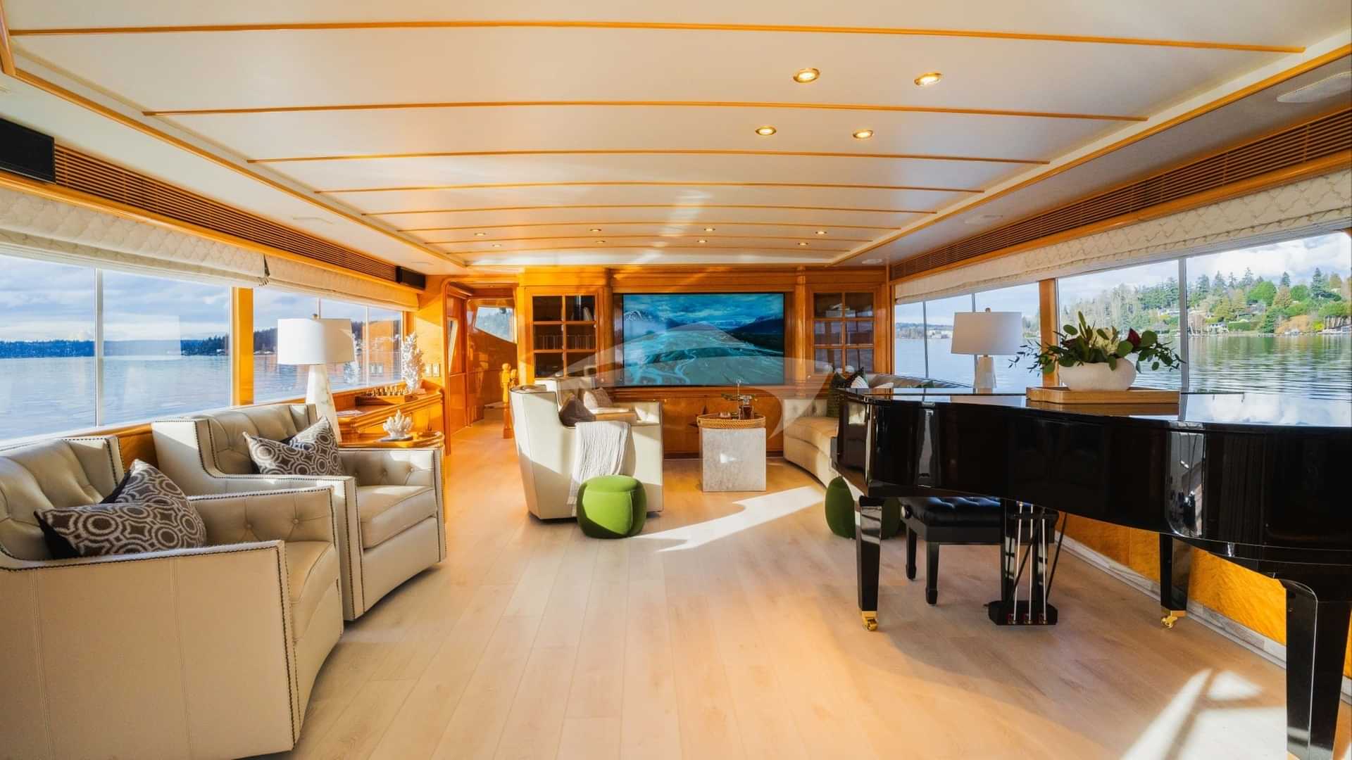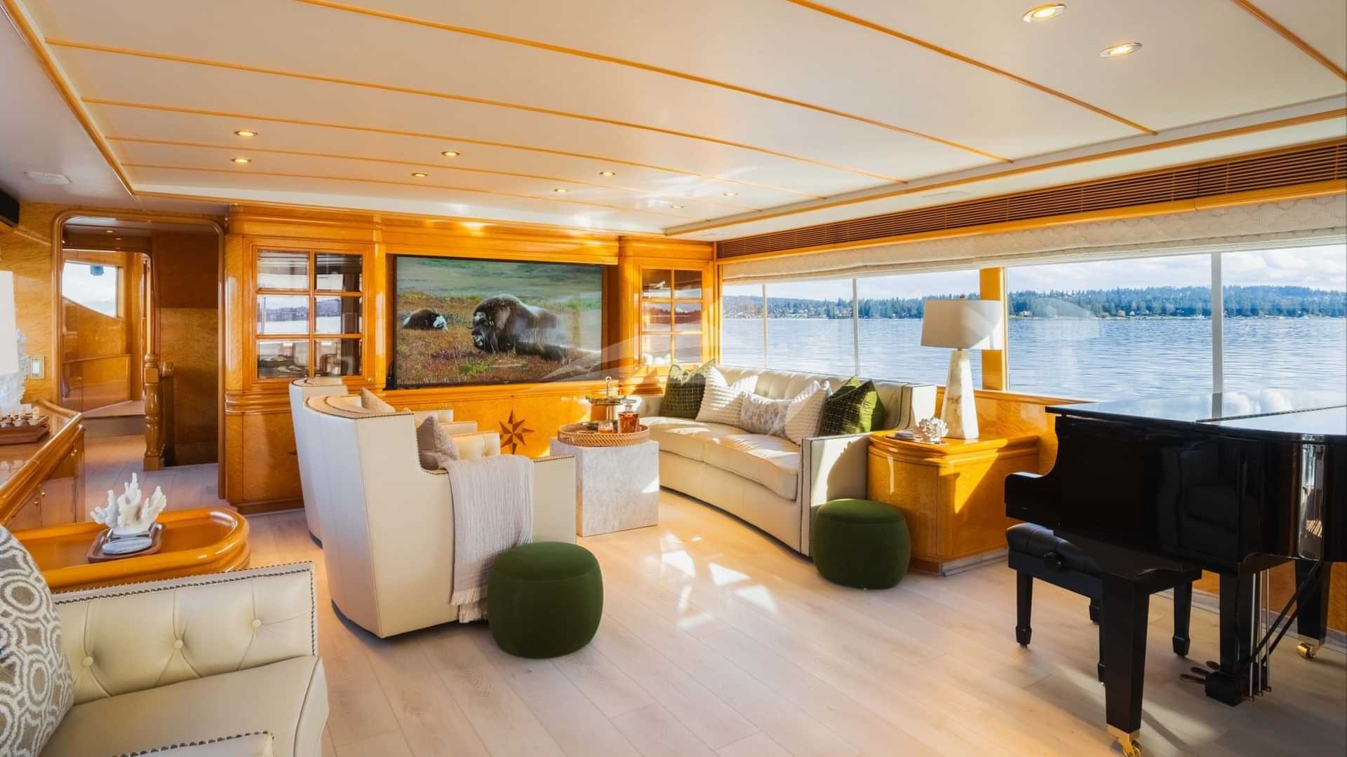 Удобства на борту для чартерных гостей включают кондиционер, велосипеды, легкие рыболовные снасти, аудиосистему в помещении, джакузи в основной каюте, пианино, стабилизаторы, солнцезащитные подушки, солярий, шезлонги, платформу для купания и телевизионный салон.