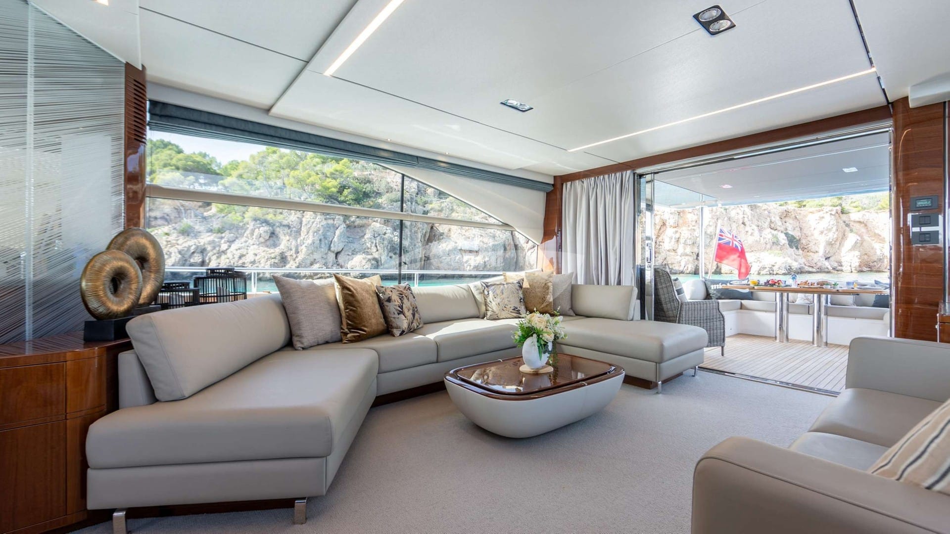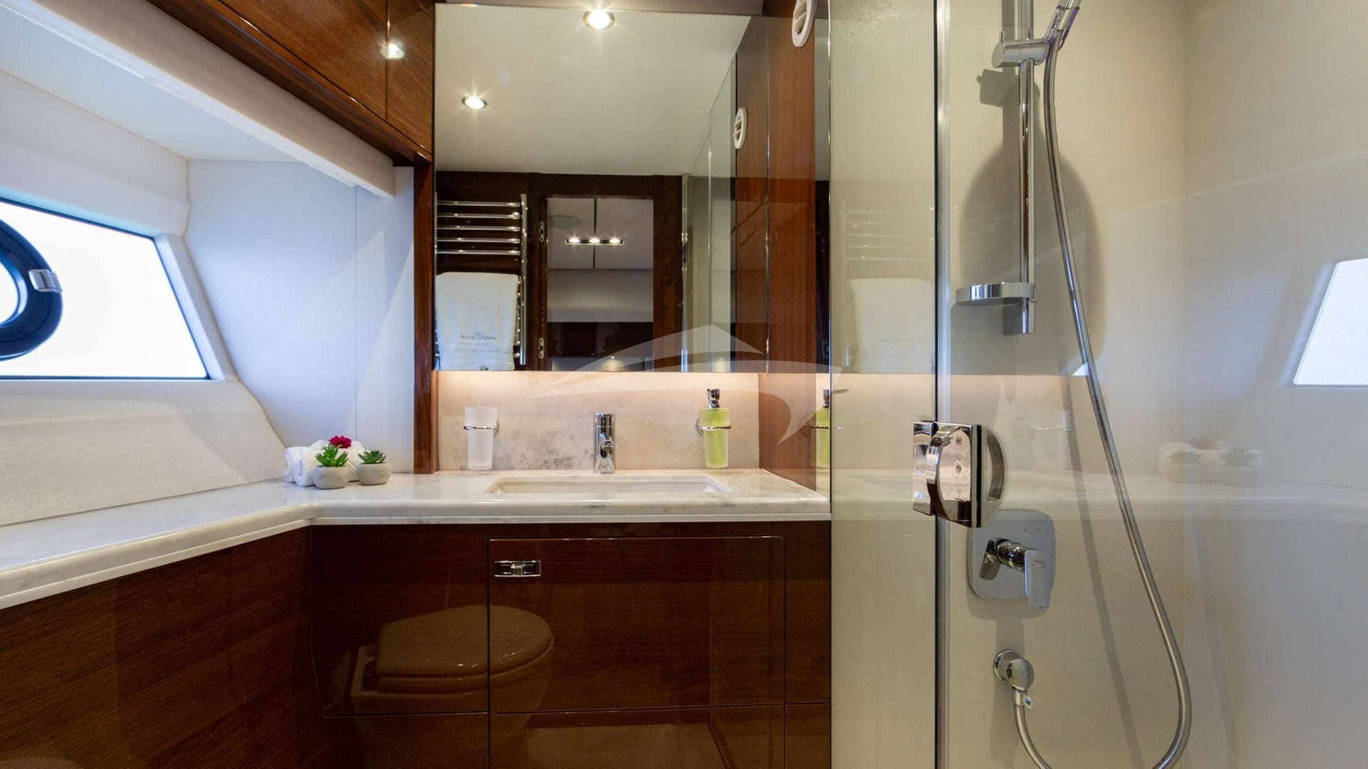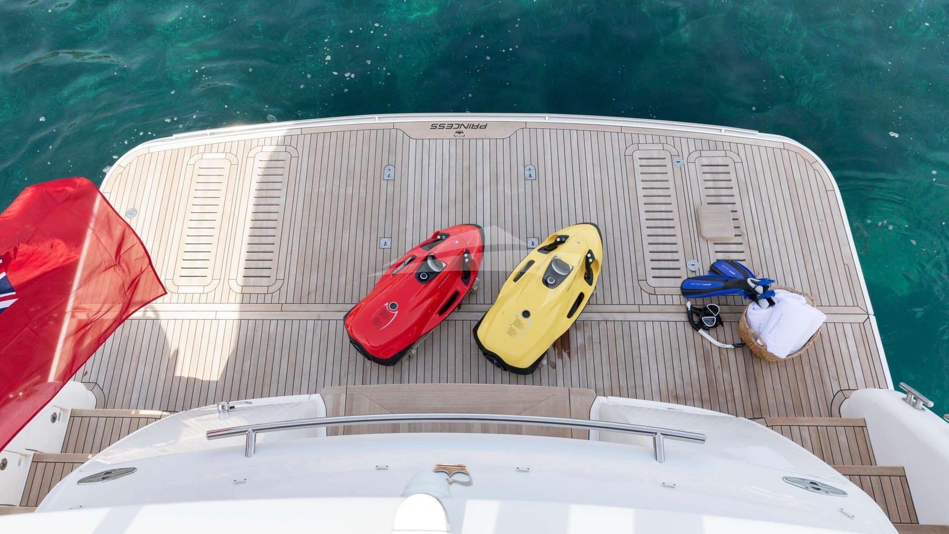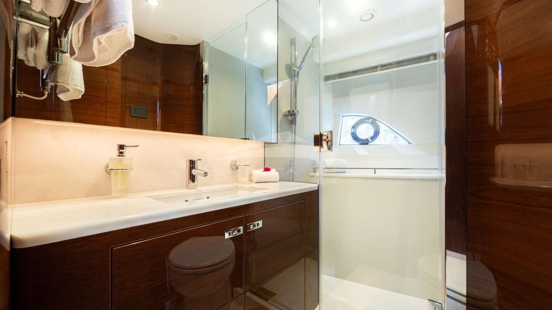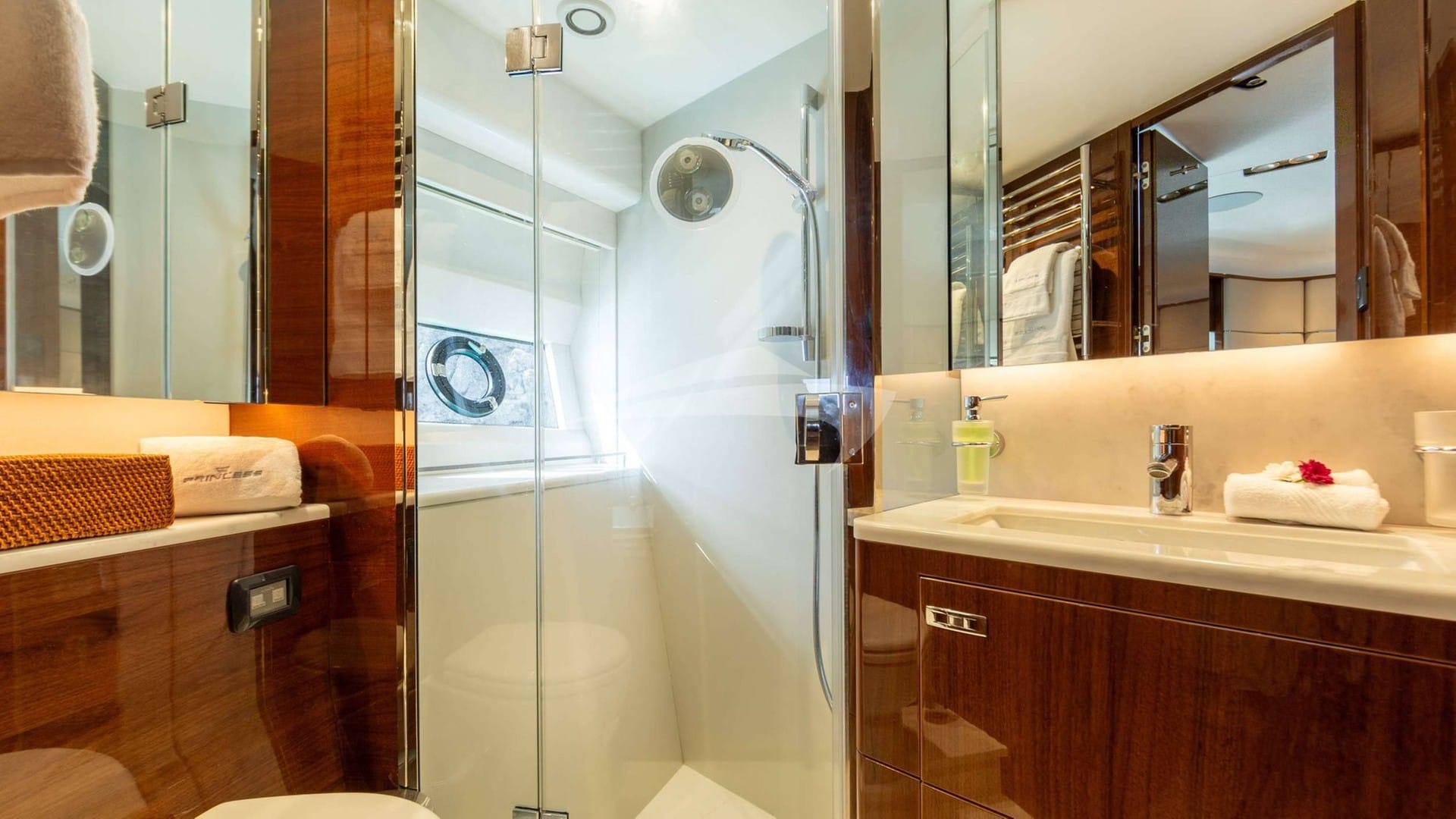 Удобства на борту для чартерных гостей включают кондиционер, барбекю, душ на открытом воздухе, аудиосистему в помещении, док-станцию для iPod, стабилизаторы на якоре, платформу для купания, телевизионный салон и Wi-Fi.