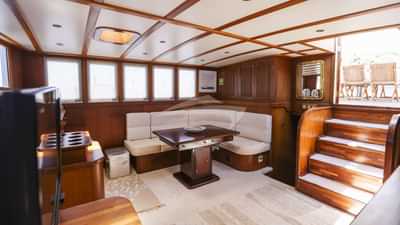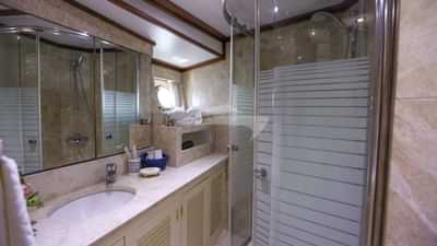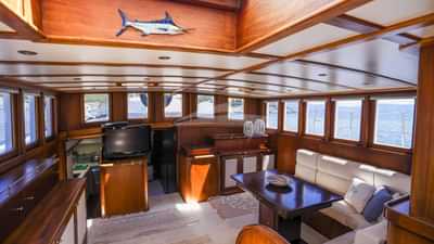 Удобства на борту для чартерных гостей включают кондиционер, душ на открытом воздухе, спутниковое телевидение, платформу для купания, телевизионный салон и Wi-Fi.