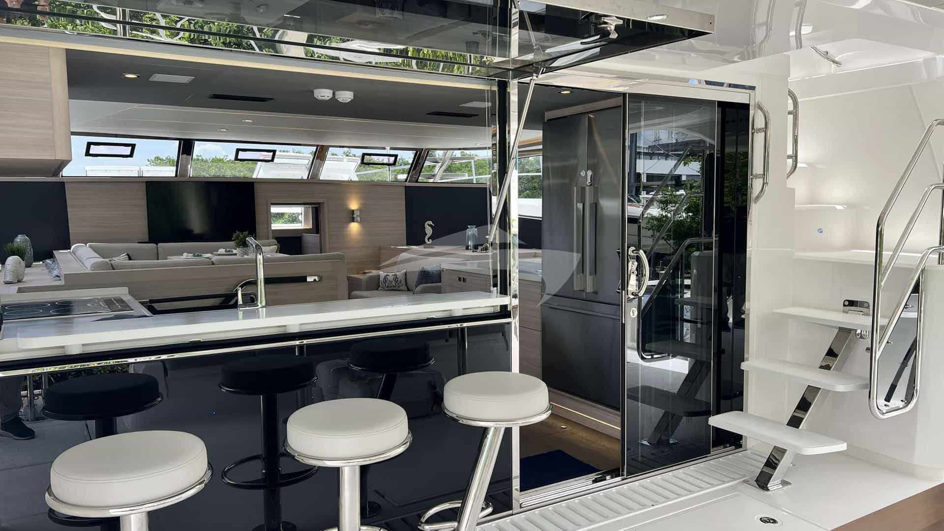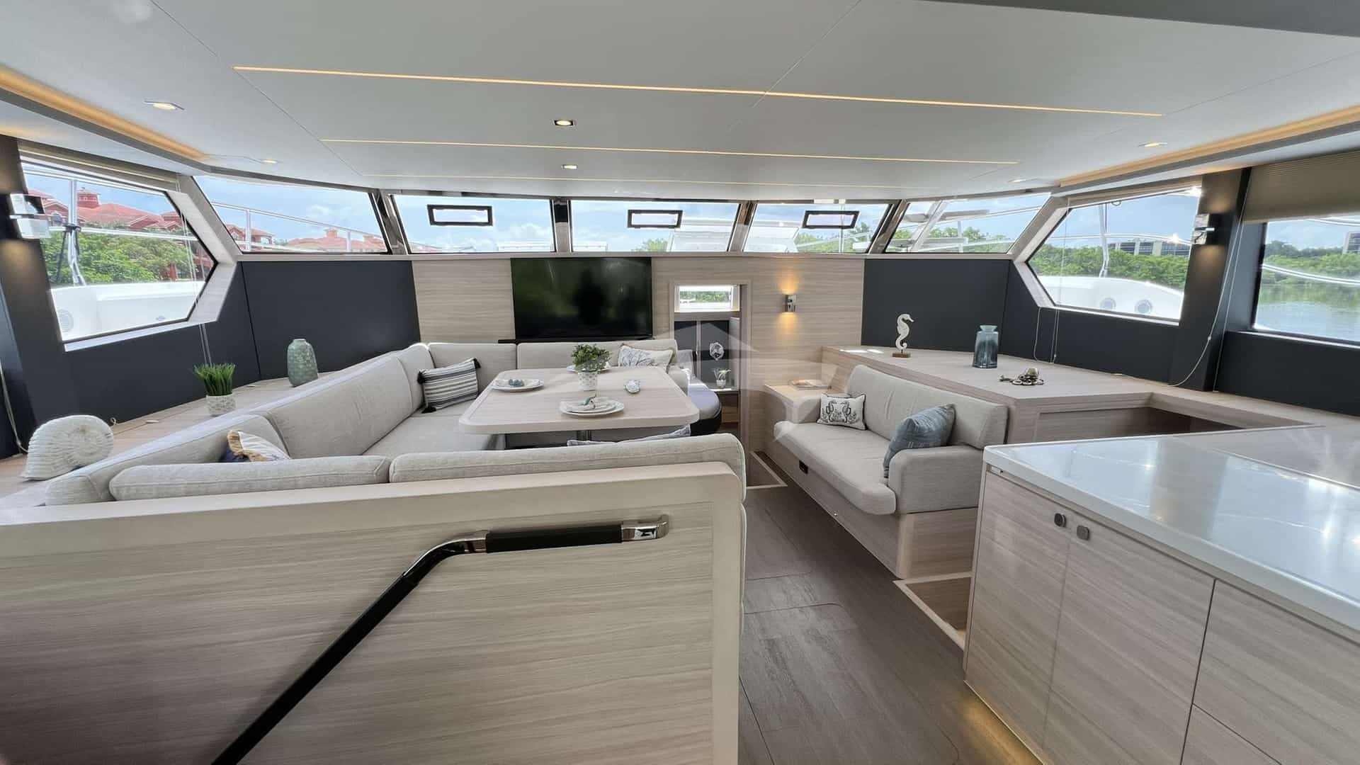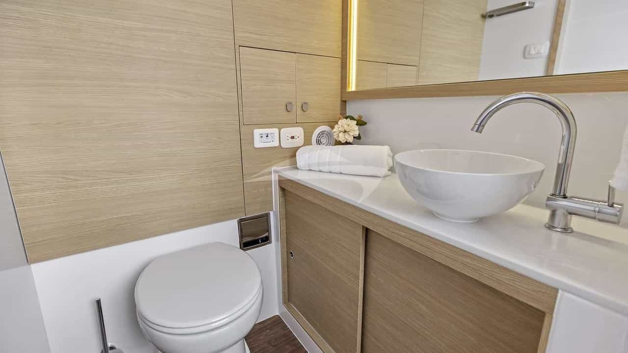 Удобства на борту для чартерных гостей включают кондиционер, барбекю, душ на открытом воздухе, аудиосистему в помещении, док-станцию для iPod, платформу для купания и телевизионный салон.