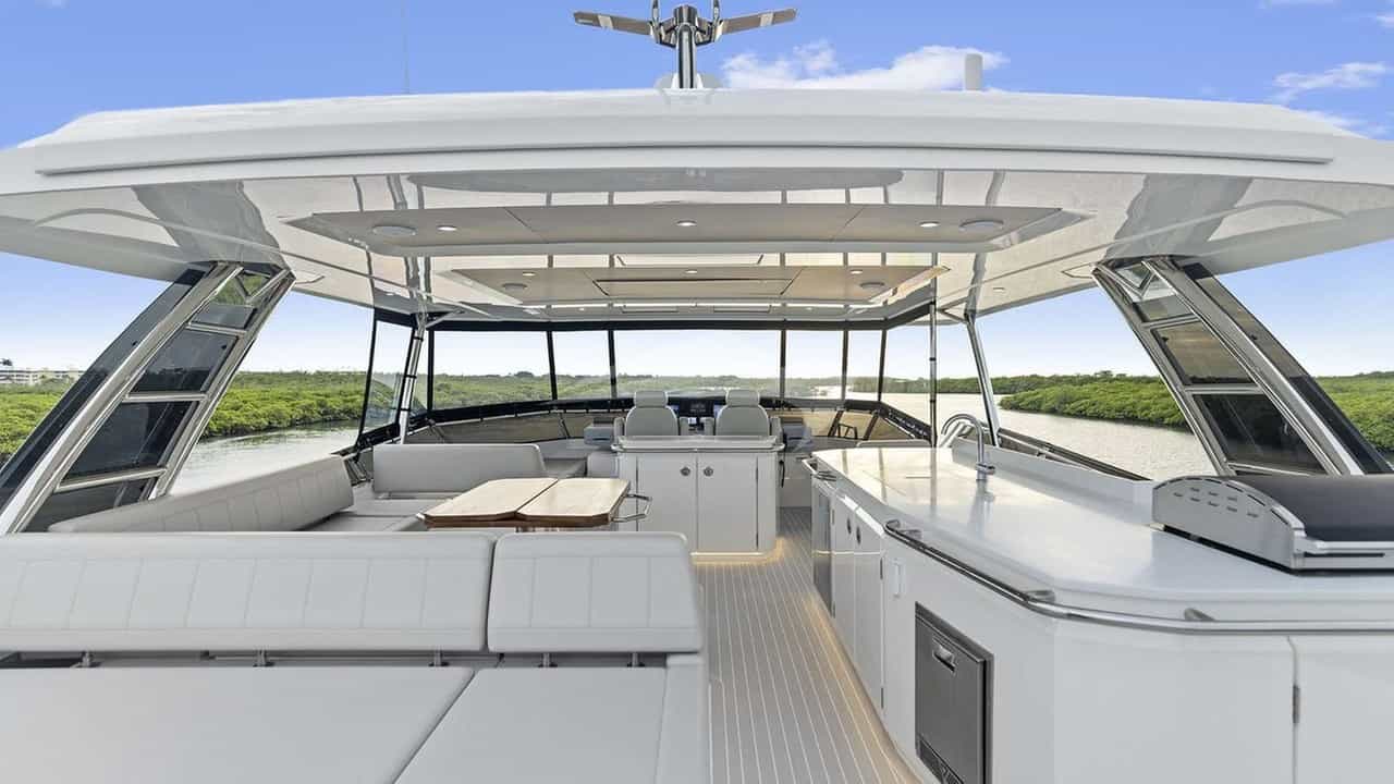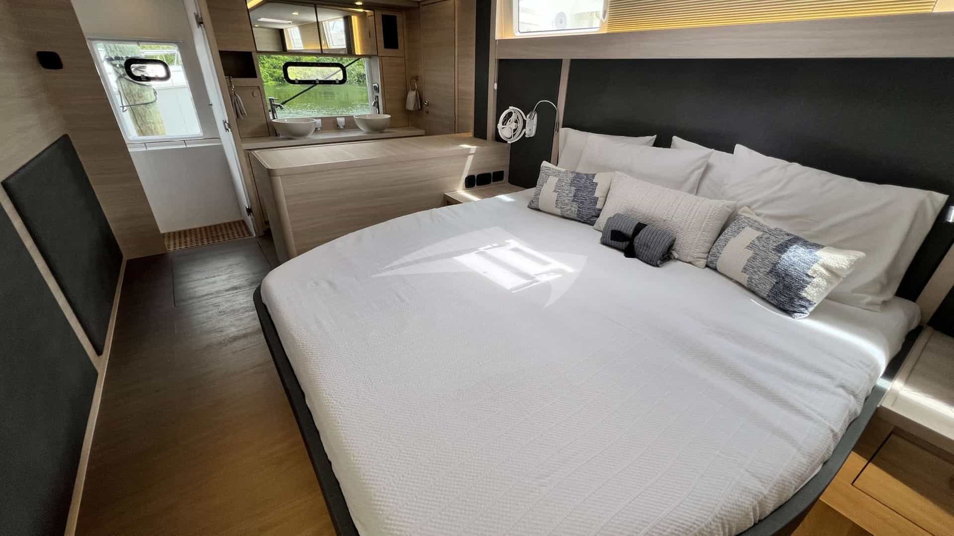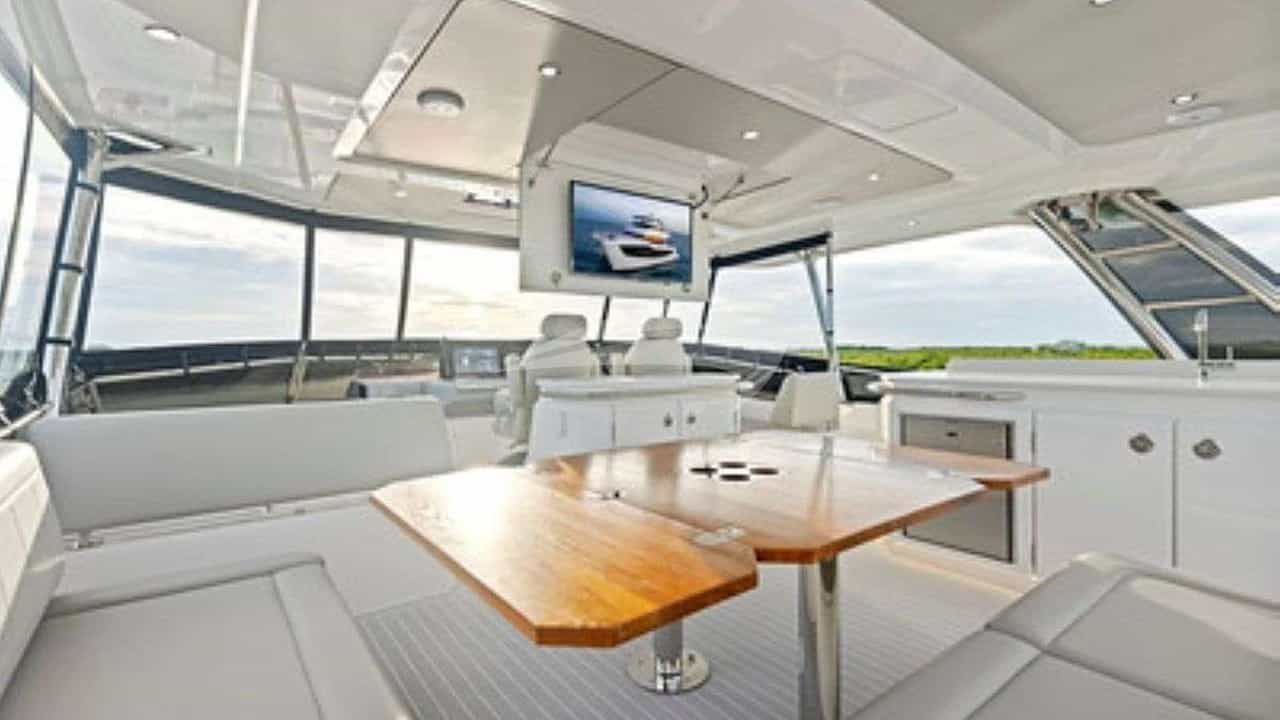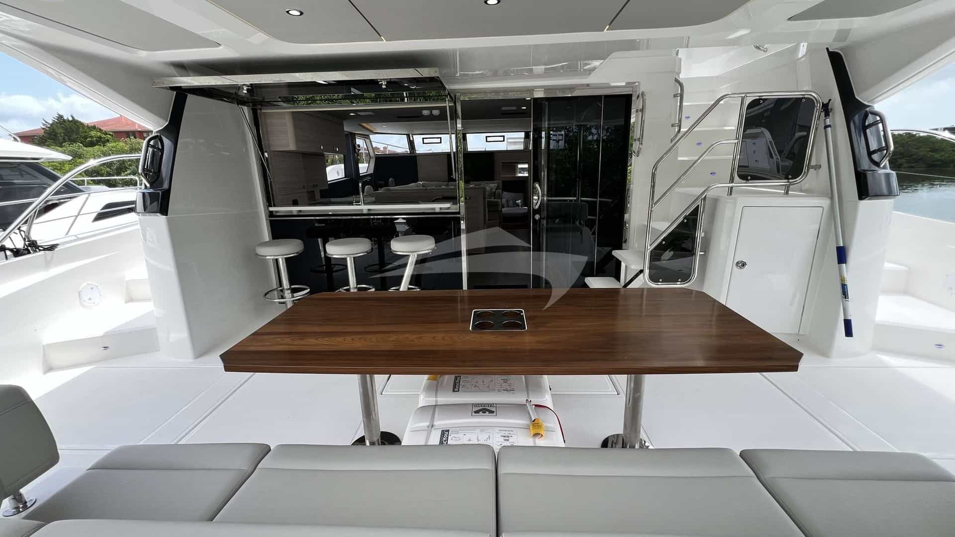 Удобства на борту для чартерных гостей включают кондиционер, барбекю, душ на открытом воздухе, аудиосистему в помещении, док-станцию для iPod, платформу для купания и телевизионный салон.