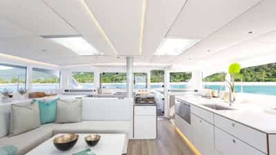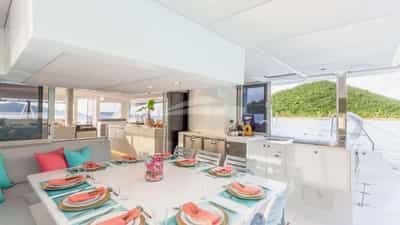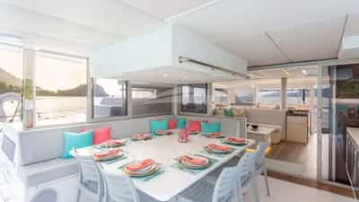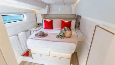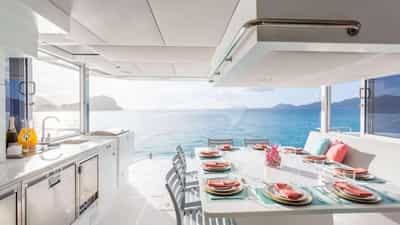 Удобства на борту для чартерных гостей включают кондиционер, барбекю, аудиосистему в помещении, платформу для купания и телевизионный салон.