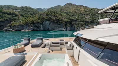Удобства на борту для чартерных гостей включают кондиционер, джакузи на палубе, спутниковое телевидение, телевизионный салон и Wi-Fi.