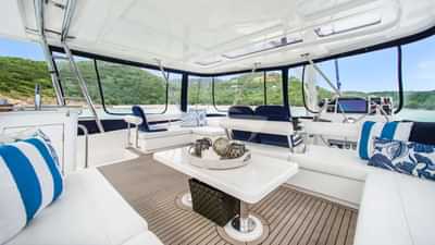 Удобства на борту для чартерных гостей включают кондиционер, барбекю, кофеварку, душ на открытом воздухе, легкие рыболовные снасти, льдогенератор, аудиосистему в помещении, док-станцию для iPod, наружную аудиосистему, специальные диеты, шезлонги, платформу для купания, ТВ-салон, водонагреватель и Wi-Fi.