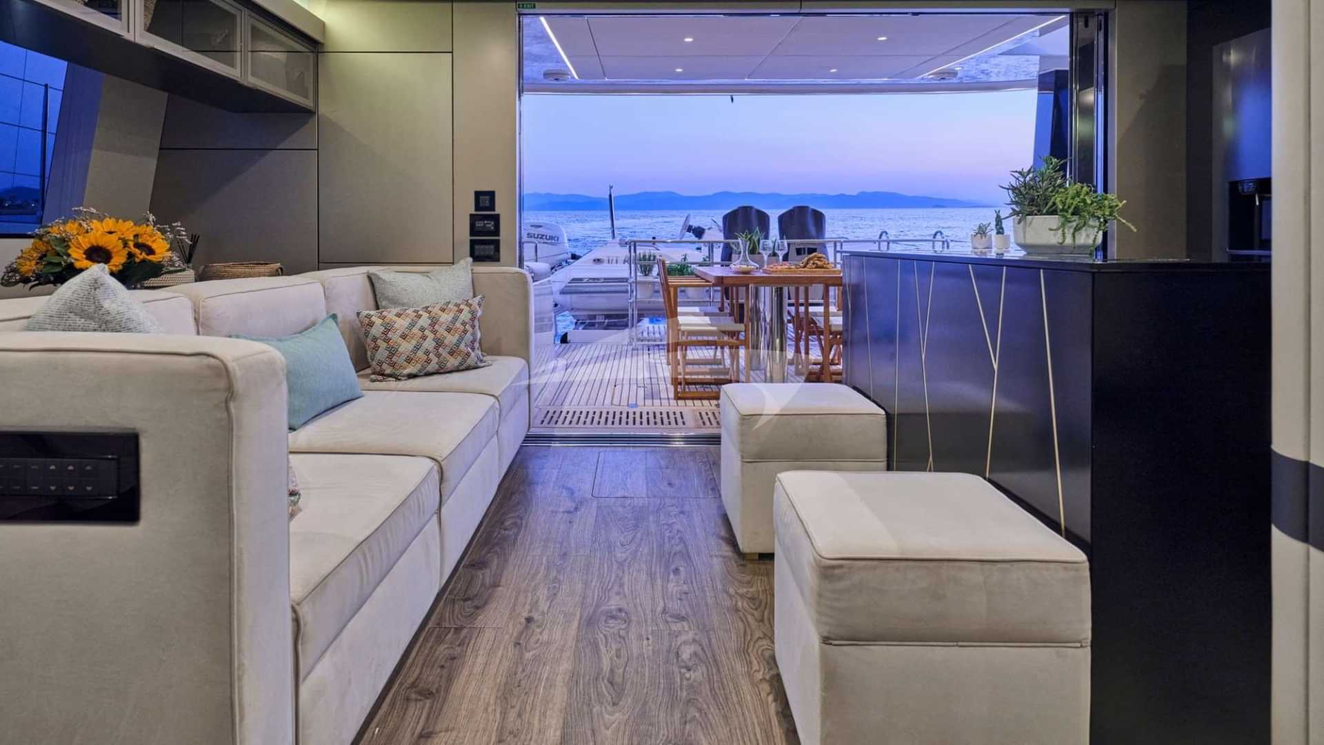 Amenities on board for the charter guests include Air Conditioning, Outdoor shower, Light fishing gear, Hydraulic Swim Platform, Indoor audio system, iPod dock, TV saloon and Wi-Fi.