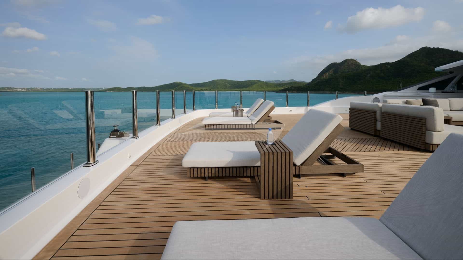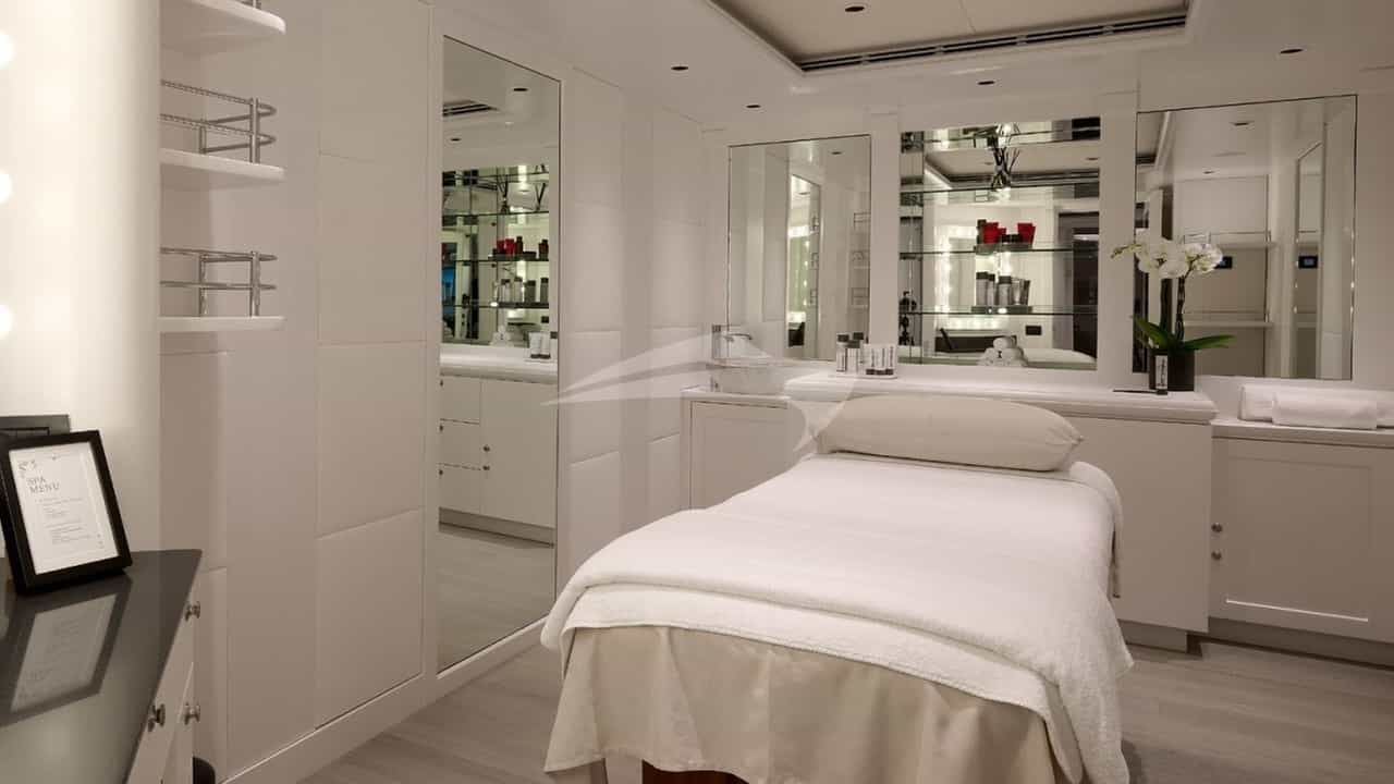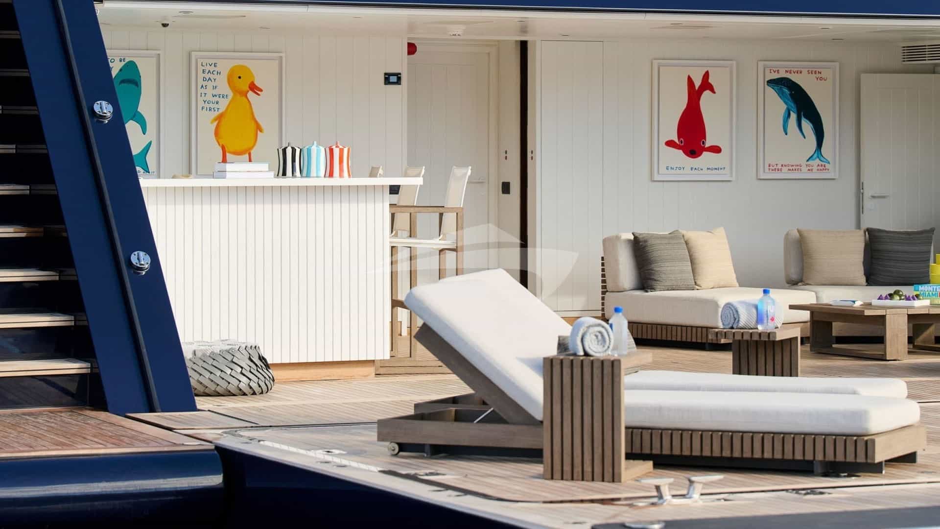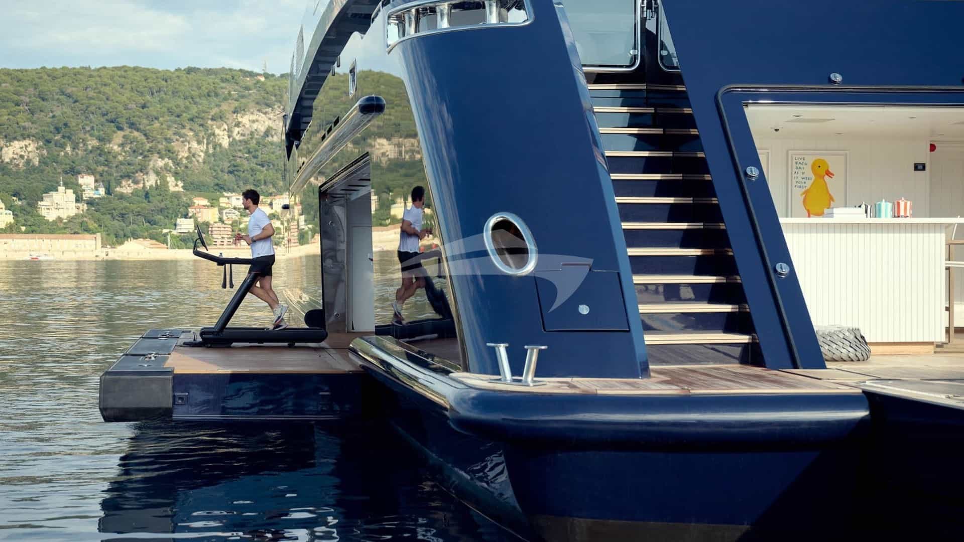 Amenities on board for the charter guests include Air Conditioning, Beach club, Bicycles, Movie Theater, Outdoor shower, Exercise equipment, Gym, Jacuzzi on deck, Stabilizers At Anchor, Sun pads, Sun loungers and Swim platform.