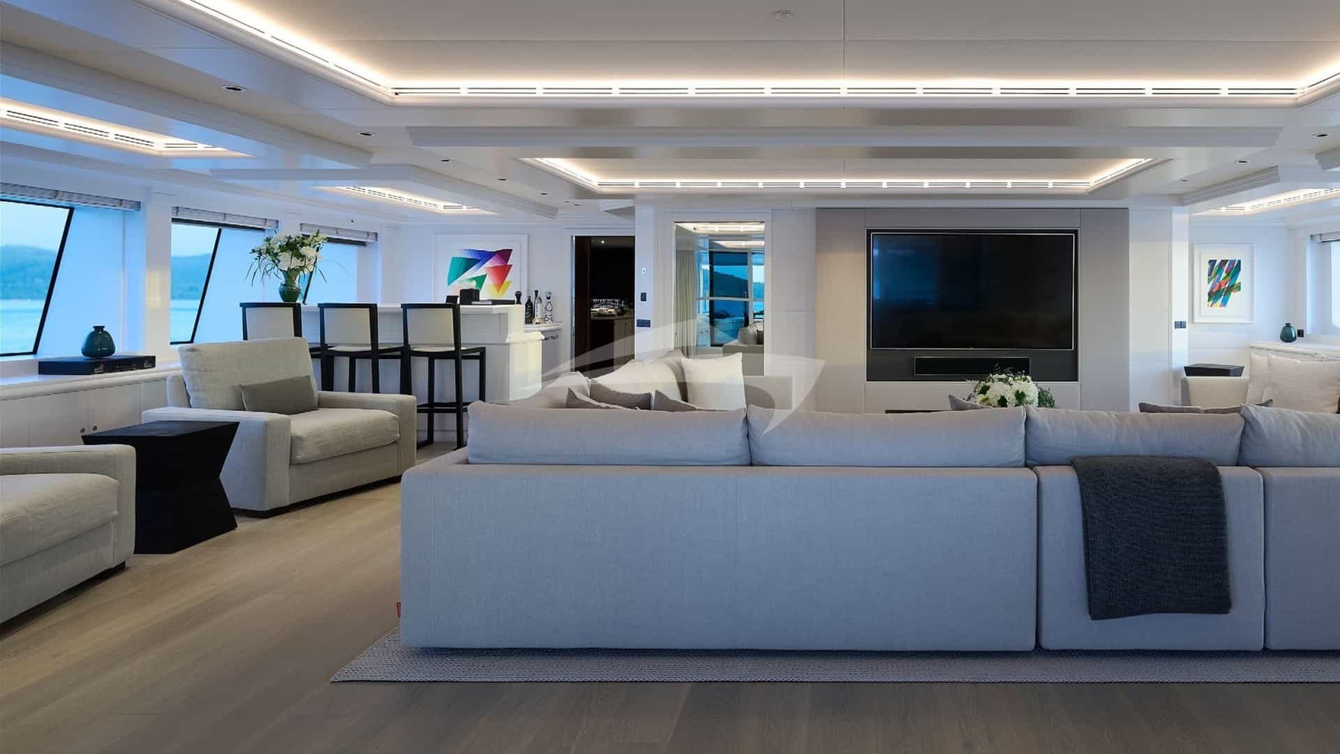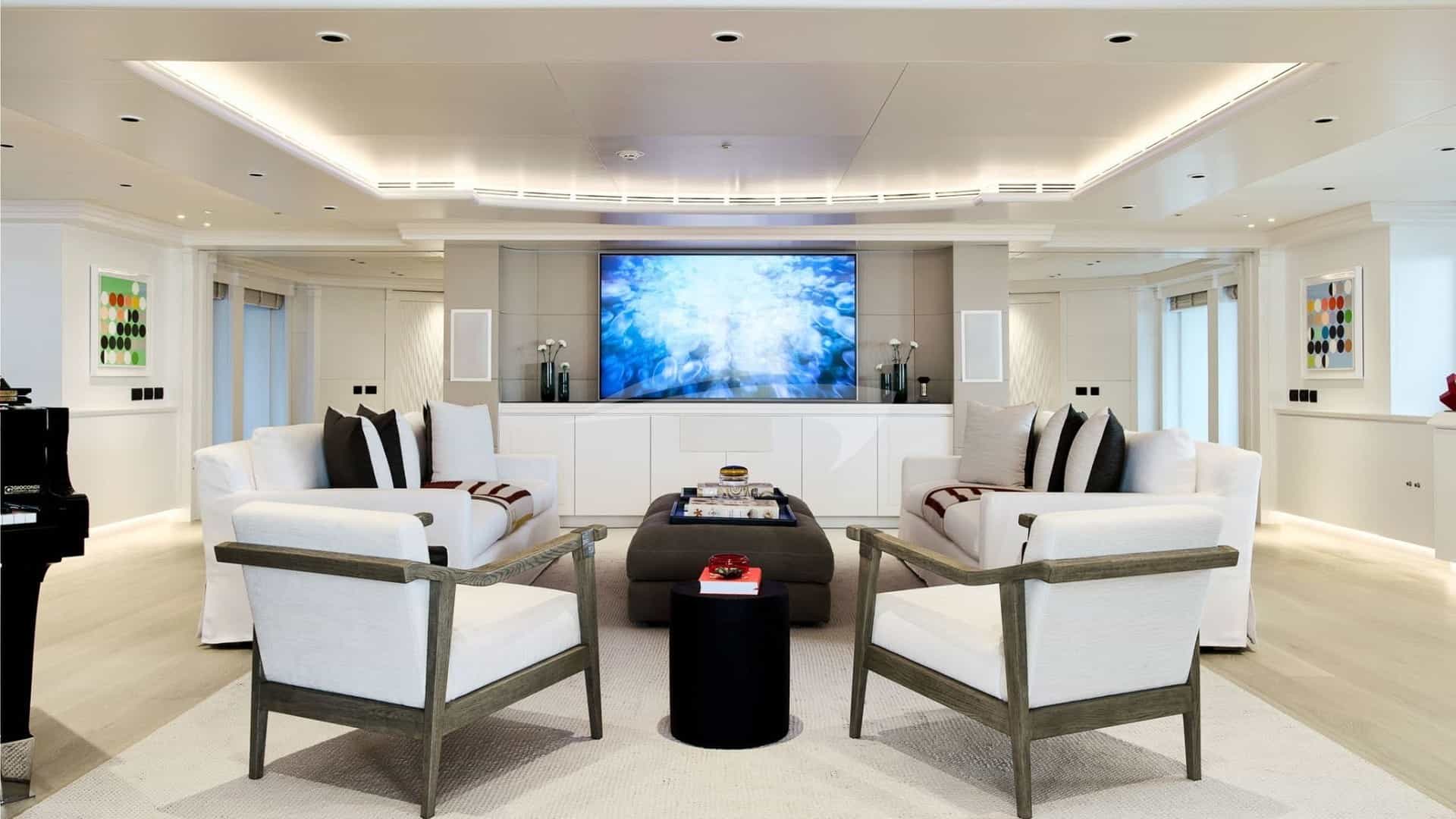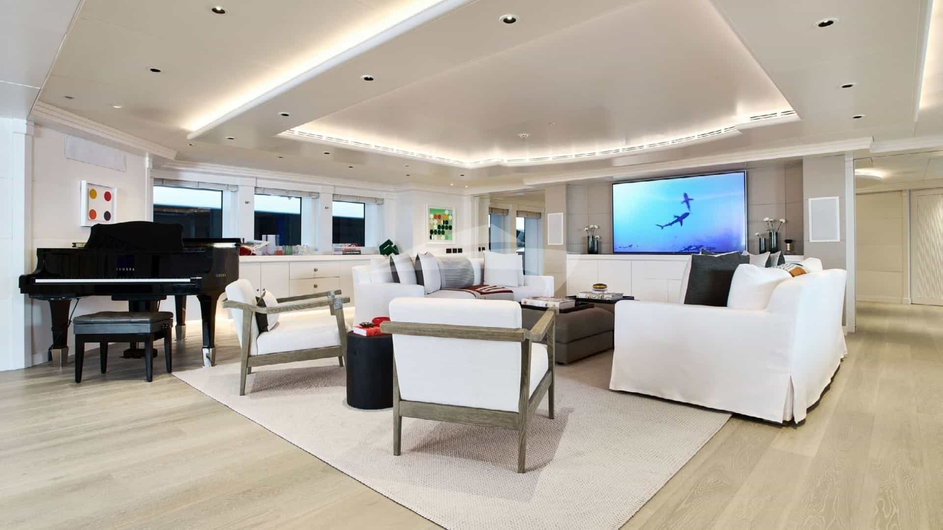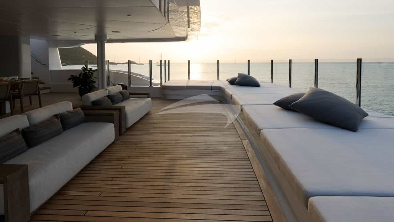Amenities on board for the charter guests include Air Conditioning, Beach club, Bicycles, Movie Theater, Outdoor shower, Exercise equipment, Gym, Jacuzzi on deck, Stabilizers At Anchor, Sun pads, Sun loungers and Swim platform.