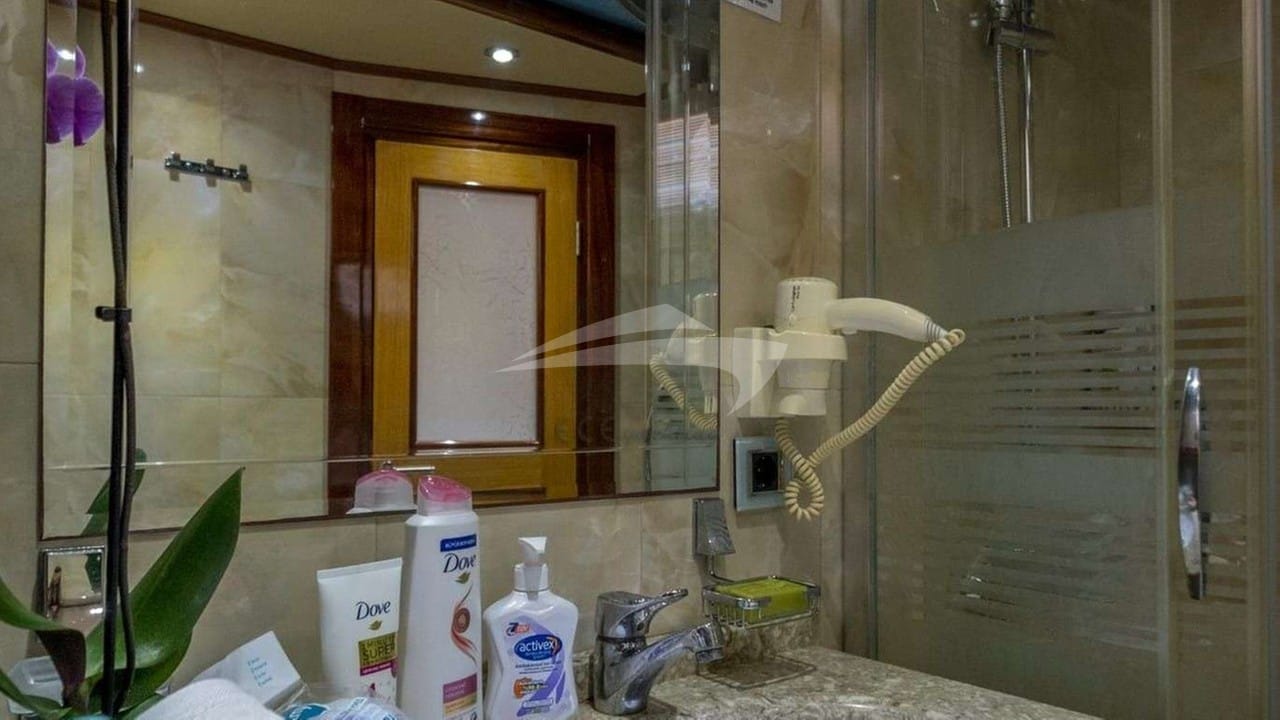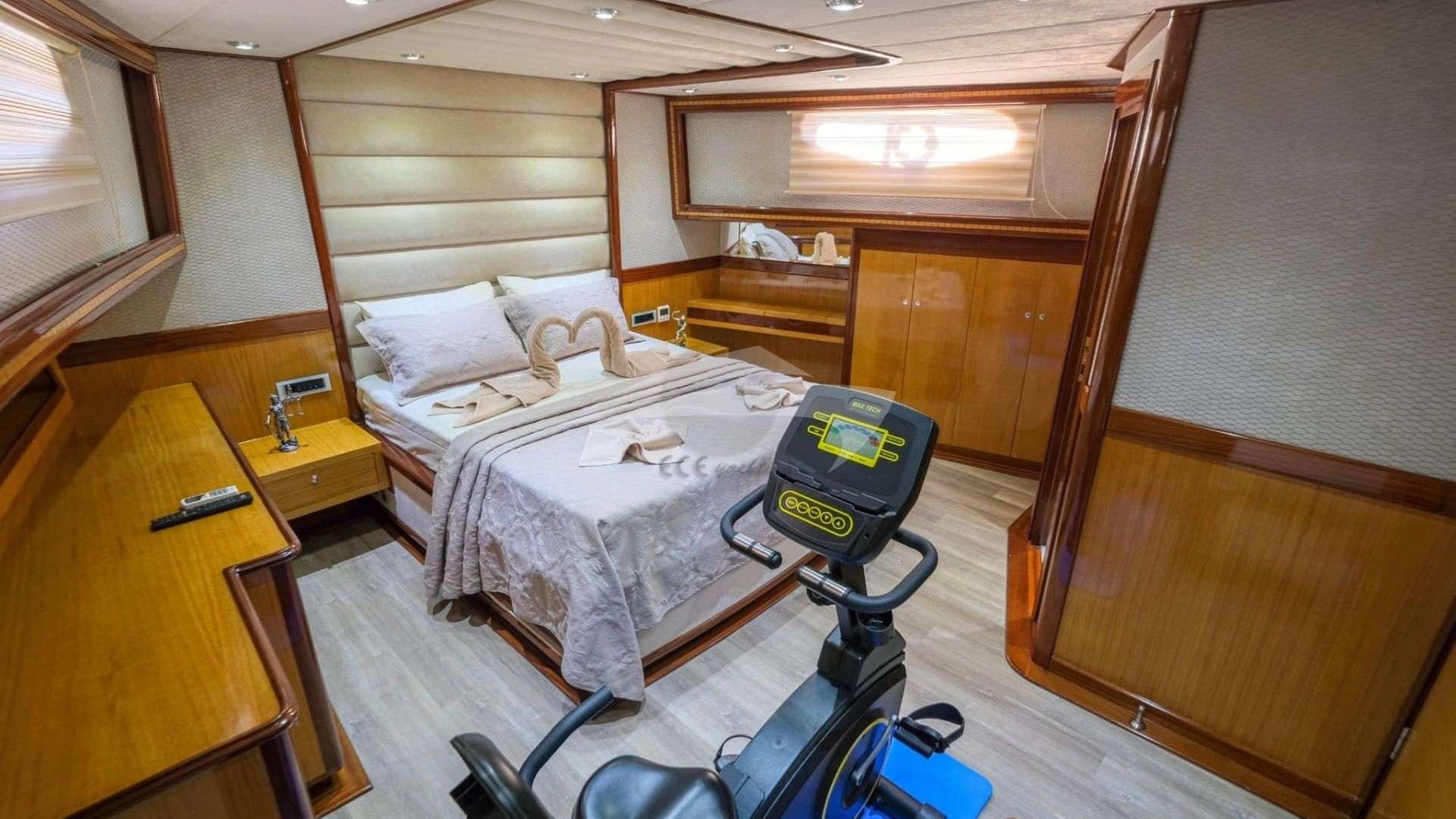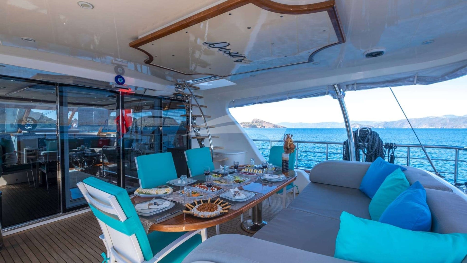 Amenities on board include Air Conditioning, BBQ, Outdoor shower, Indoor audio system, iPod dock, Satellite TV, TV saloon and Wi-Fi.