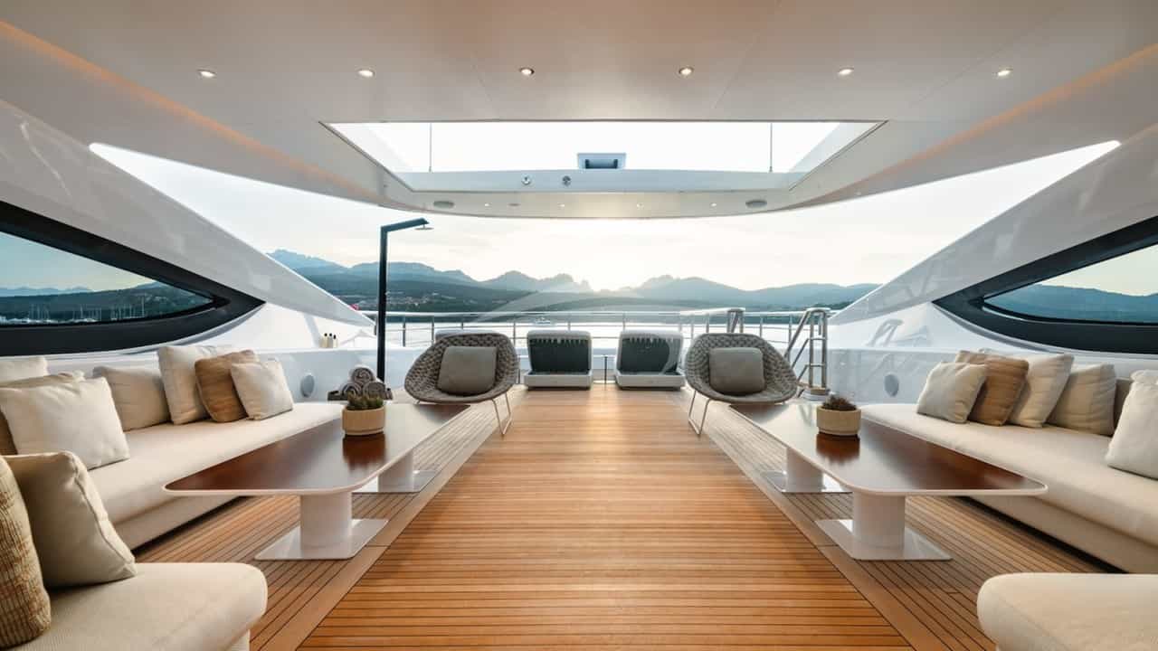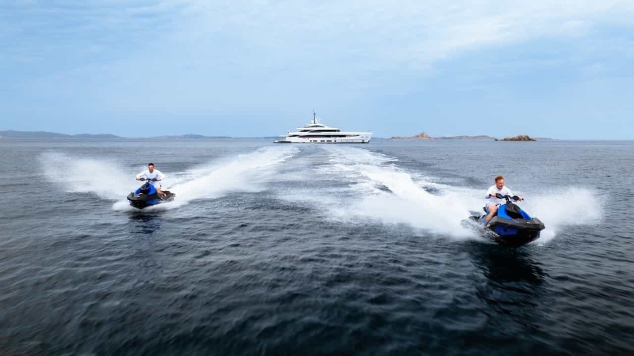 Amenities on board for the charter guests include Air Conditioning, BBQ, Beach club, Coffee machine, Exercise equipment, Light fishing gear, Gym, Gym Equipment, Ice maker, Indoor audio system, iPod dock, Jacuzzi on deck, Media movie server, Outdoor audio system, Outdoor Bar, Satellite TV, Stabilizers, Stabilizers At Anchor, Starlink Satellite Internet, Sun pads, Sun Deck, Swim platform, Swimming pool, TV all cabins, TV primary cabin, TV saloon, Water maker and Wi-Fi.