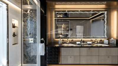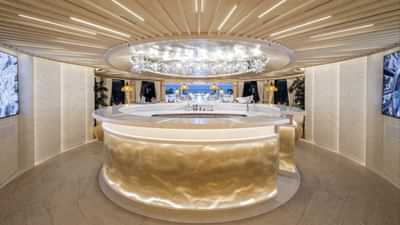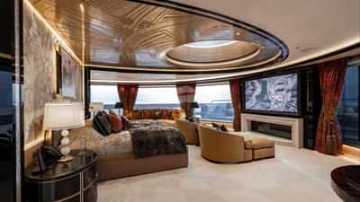 Bathrooms are Japanese styled with onyx and black marble, gold inlays and Murano chandeliers. Bar areas are Eastern inspired with copper accents, panoramic glass panels and dramatic lighting, mixing tradition with modernity.The staircase is a showstopper, a cream marble and black marble beauty with over 1,500 lights and bronze finished woodwork. It links all guest areas and is a sculptural tour through the yacht’s interior.