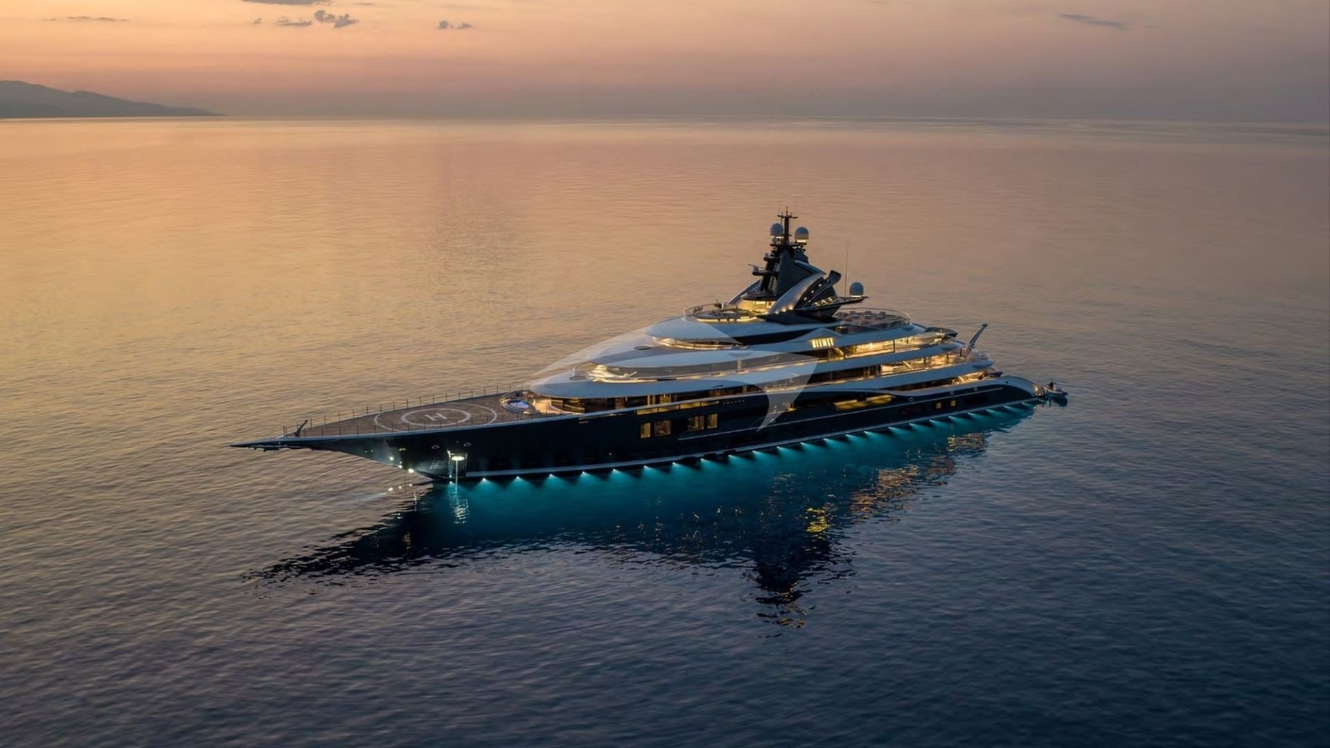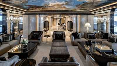 Interior design by Reymond Langton Design is a symphony of styles, themes and materials across multiple zones, with luxurious interiors and unique design features and material selections. The main saloon has hand painted de Gournay ceilings and a champagne toned metallic centerpiece by Neal Feay. Fireplaces and a giant Boganyi piano and video wall.
