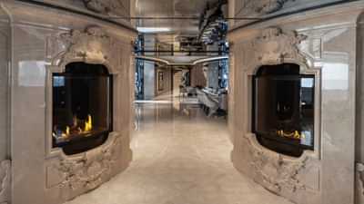 Each room has its own identity and mood. The nightclub is bubblegum pink and turquoise, interactive video walls and a sunken dance floor, the formal dining room has twin fireplaces carved in marble, geometric floor patterns and mirrored ceilings.