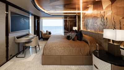 Kismet accommodates 20 guests in 11 luxurious suites. The master suite is over 2 decks and has a private jacuzzi, twin en suites and dressing rooms, a conference ready master office and a private sunbathing area. The design features scalloped gold leaf panels, red leather and bespoke marquetry by Silverlining. The yacht’s luxurious amenities and spacious accommodation reflects the owner’s opulent lifestyle, for high end leisure and entertainment.