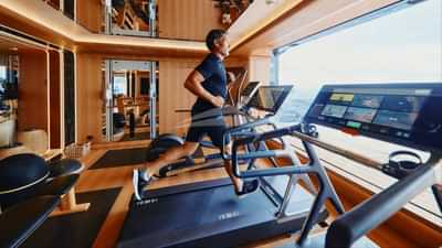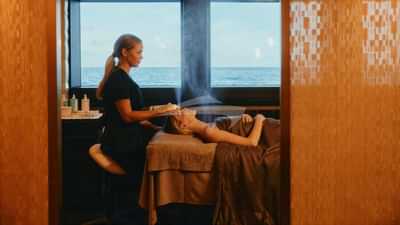 The spa area is designed for tranquility with mid-brown leather panels, floating cream chairs and marble floors. A glass walled gym with running, climbing and cycling equipment and sea views. The beauty salon complements the spa offering so every guest feels pampered from arrival to departure.
