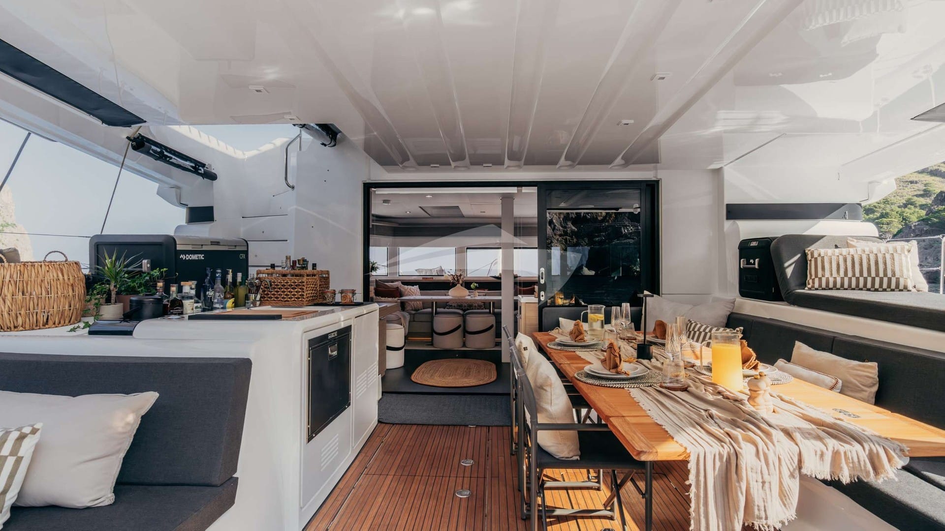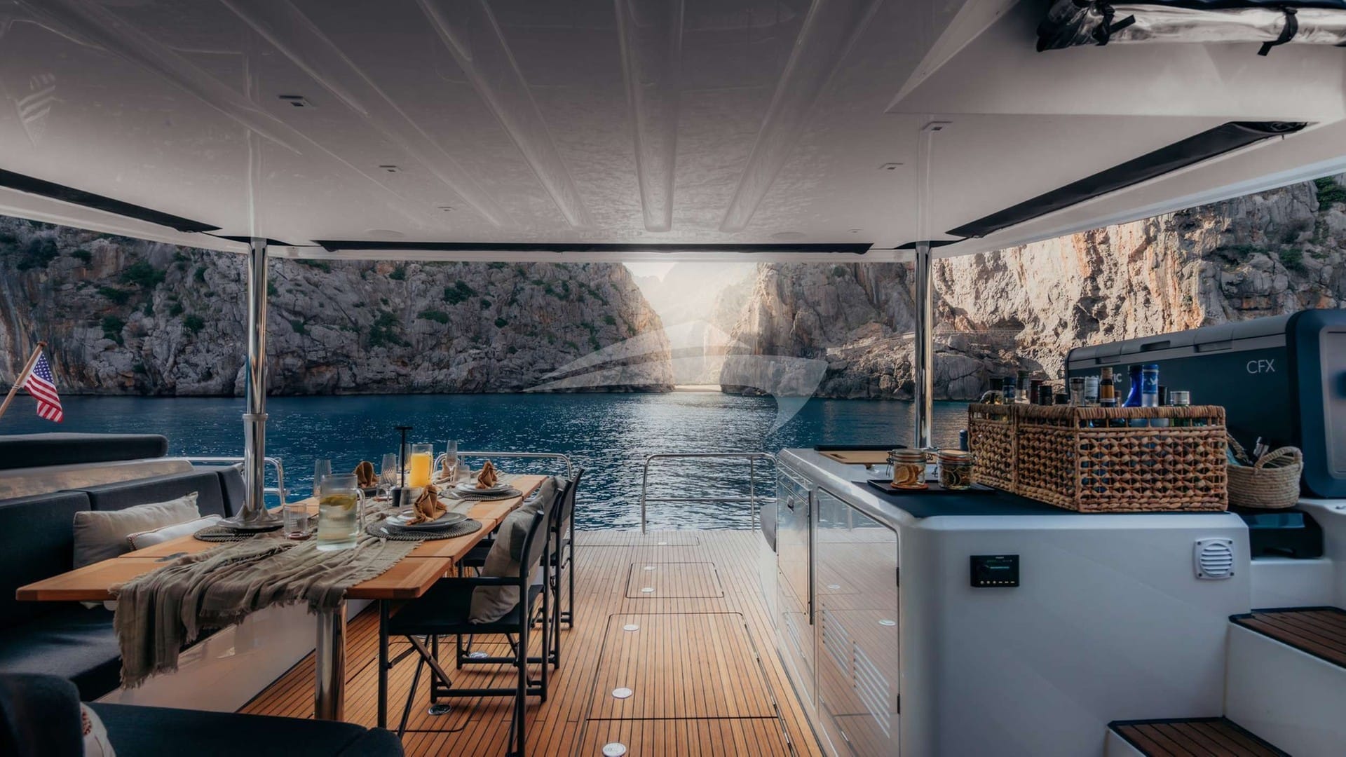 Amenities on board for the charter guests include Air Conditioning, BBQ, Outdoor shower, Gym, Indoor audio system, iPod dock, Swim platform, TV saloon and Wi-Fi.