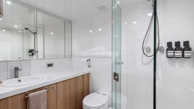 The guest cabins comprise a primary suite with a king size bed and en-suite bathroom facilities and 3 cabins with a queen size bed and en-suite bathroom facilities.