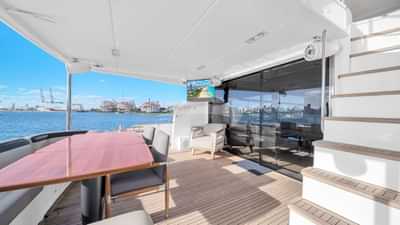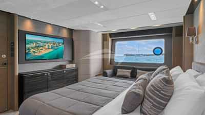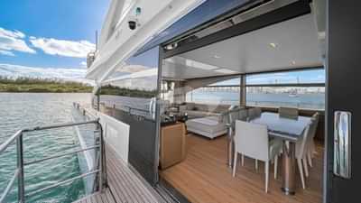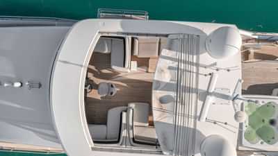 Amenities on board for the charter guests include Air Conditioning, BBQ, Outdoor shower, Indoor audio system, iPod dock, Jacuzzi on deck, Satellite TV, Swim platform and TV saloon.