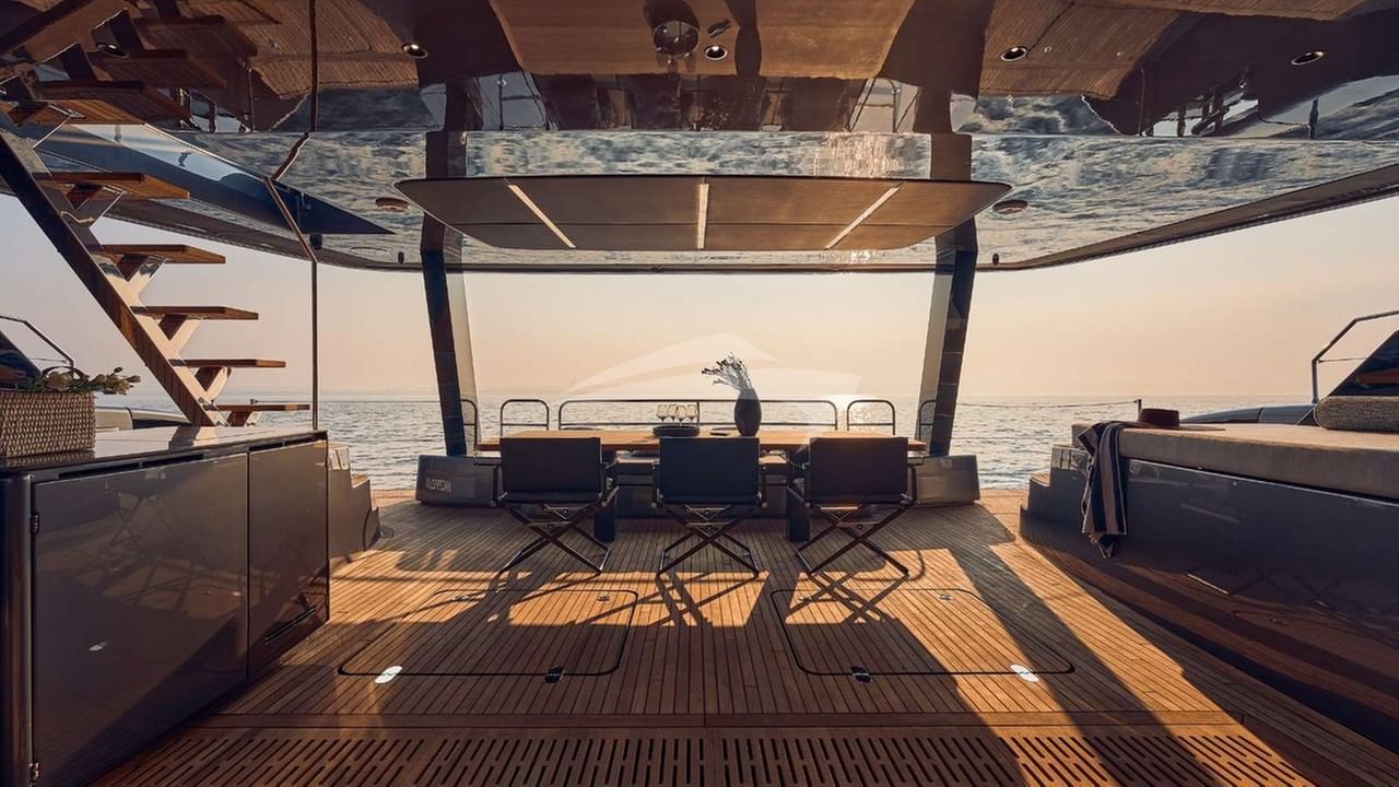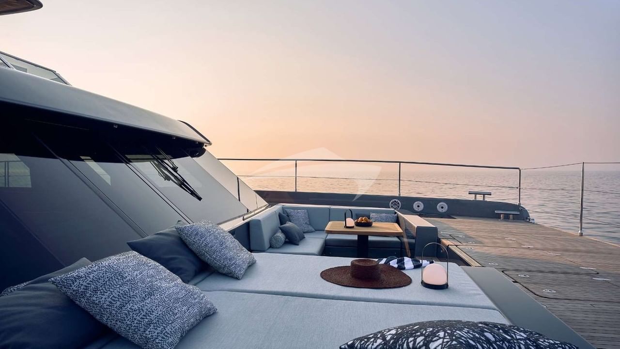 Amenities on board include Air Conditioning, BBQ, Outdoor shower, Indoor audio system, iPod dock, Jacuzzi on deck, Satellite TV, Swim platform, TV saloon and Wi-Fi.