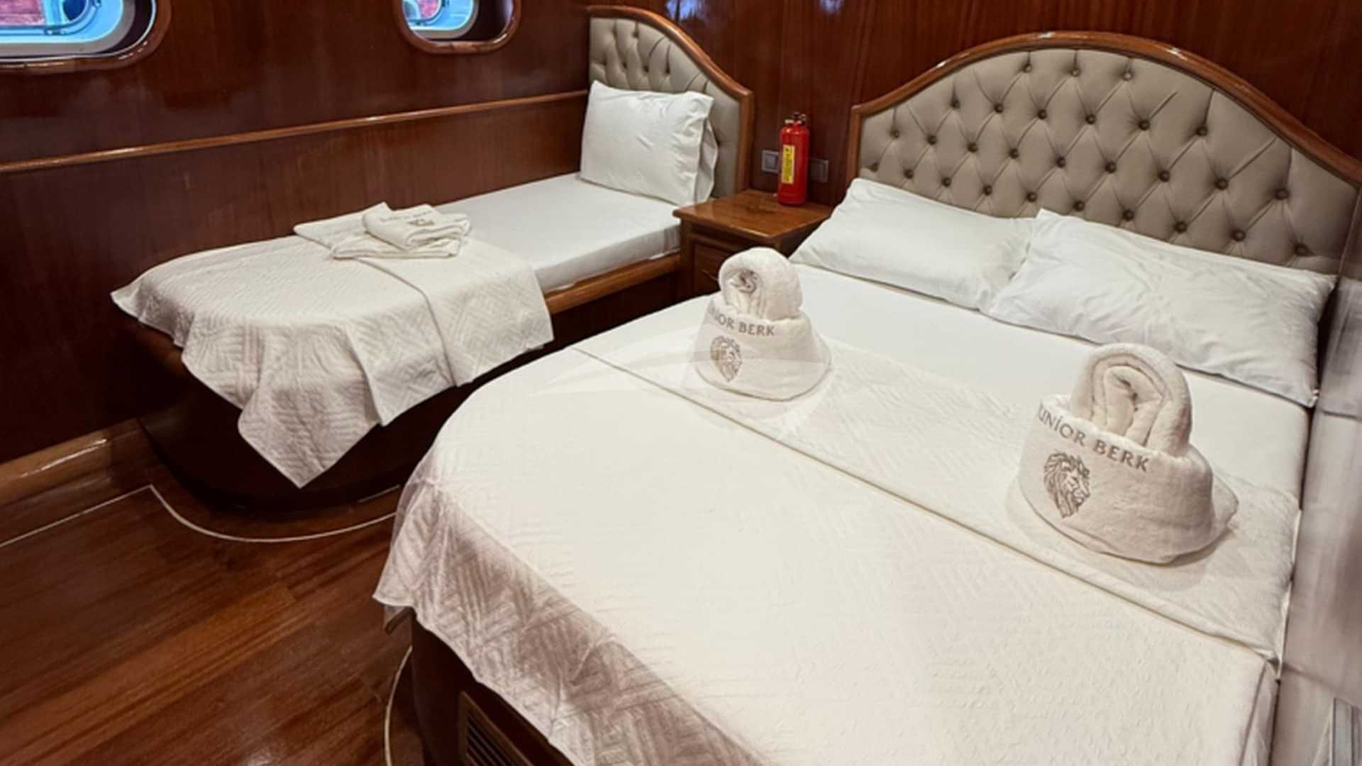 JUNIOR BERK can accommodate 12 sleeping guests on board in 6 cabins.