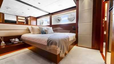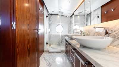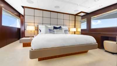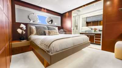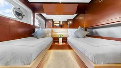 The guest cabins comprise a primary suite with a king size bed and en-suite bathroom facilities located on the main deck, a VIP suite with a queen size bed and en-suite bathroom facilities, a VIP suite with a queen size bed and en-suite bathroom facilities, a cabin with 2 single beds and en-suite bathroom facilities and a cabin with 2 single beds and a pullman bed and en-suite bathroom facilities.