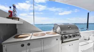 Amenities on board for the charter guests include Air Conditioning, BBQ, Big game fishing gear, Light fishing gear, Gym Equipment, Jacuzzi on deck, Outdoor Bar and Wi-Fi.