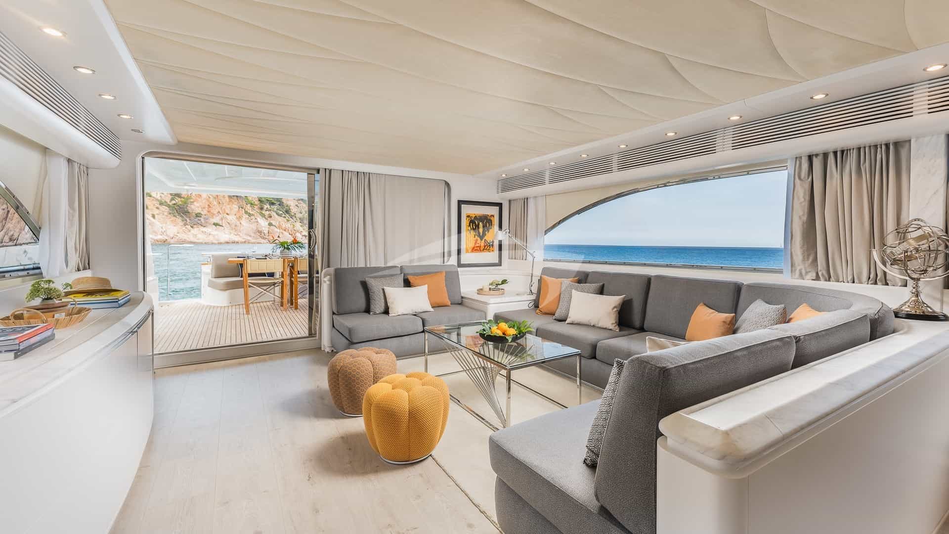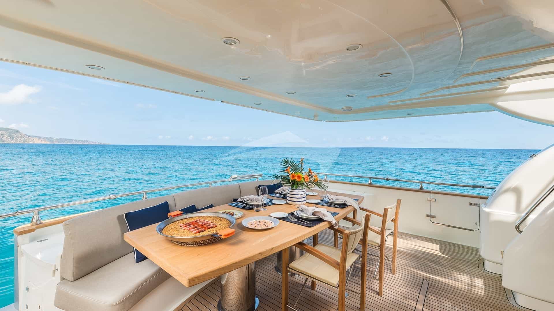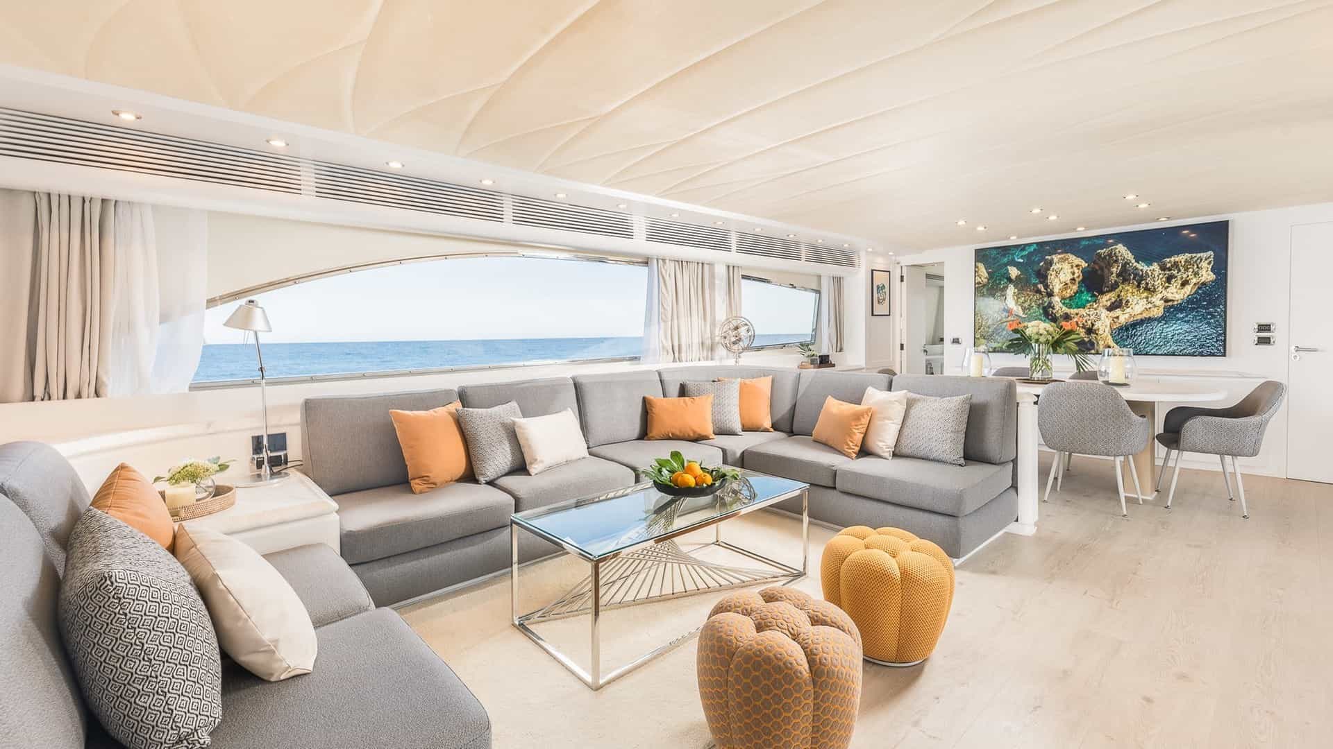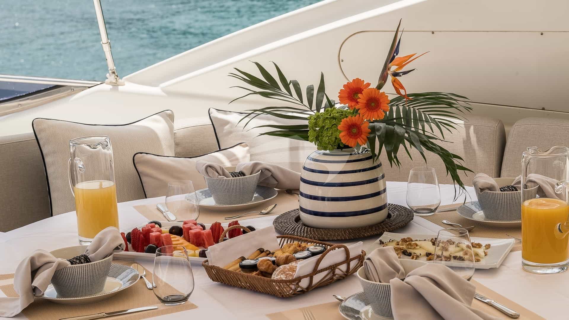 Amenities on board for the charter guests include Air Conditioning, BBQ, Bow Thruster, Crane, Outdoor shower, Jacuzzi in primary cabin, Stabilizers, Stabilizers At Anchor, Stern Thruster, Sun pads, Sun Deck, Sun loungers, Swim platform, TV all cabins, TV primary cabin, TV saloon and Wi-Fi.