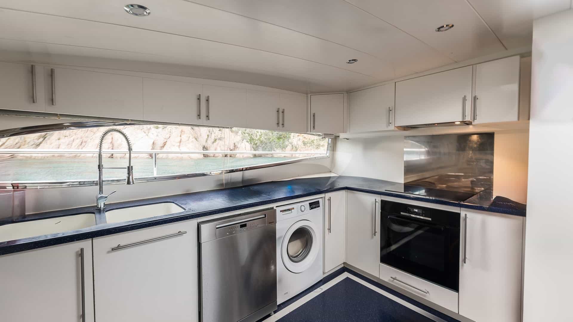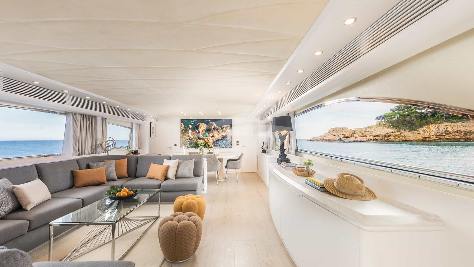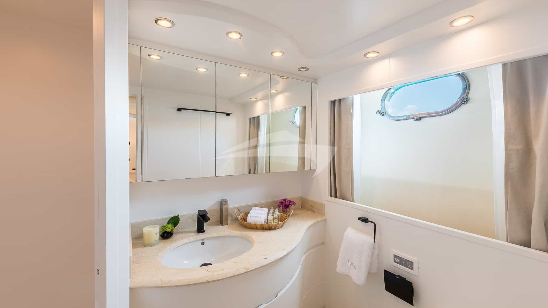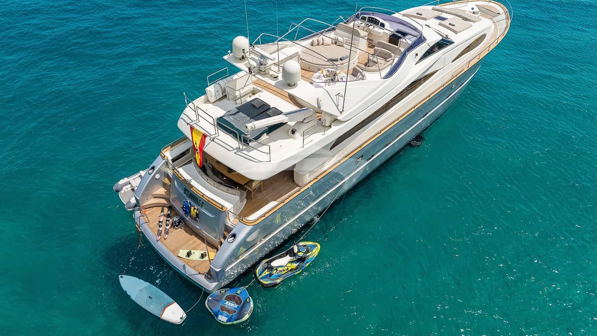 Amenities on board for the charter guests include Air Conditioning, BBQ, Bow Thruster, Crane, Outdoor shower, Jacuzzi in primary cabin, Stabilizers, Stabilizers At Anchor, Stern Thruster, Sun pads, Sun Deck, Sun loungers, Swim platform, TV all cabins, TV primary cabin, TV saloon and Wi-Fi.