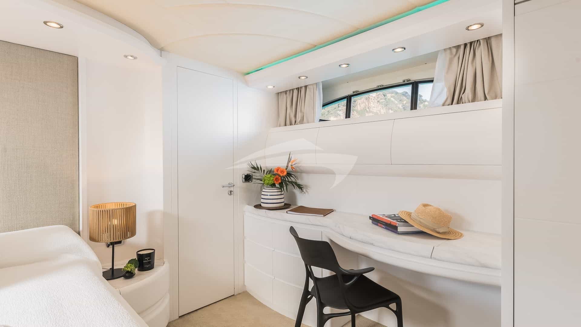 The guest cabins comprise a primary suite with a king size bed and en-suite bathroom facilities, a VIP suite with a king size bed and en-suite bathroom facilities and 2 cabins with a twin bed and a pullman bed and en-suite bathroom facilities.