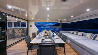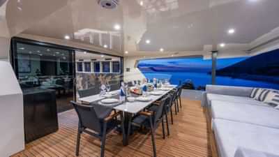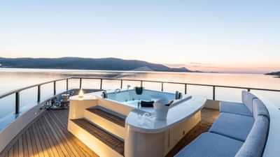 Amenities on board for the charter guests include Air Conditioning, BBQ, Outdoor shower, iPod dock, Jacuzzi on deck and TV saloon.