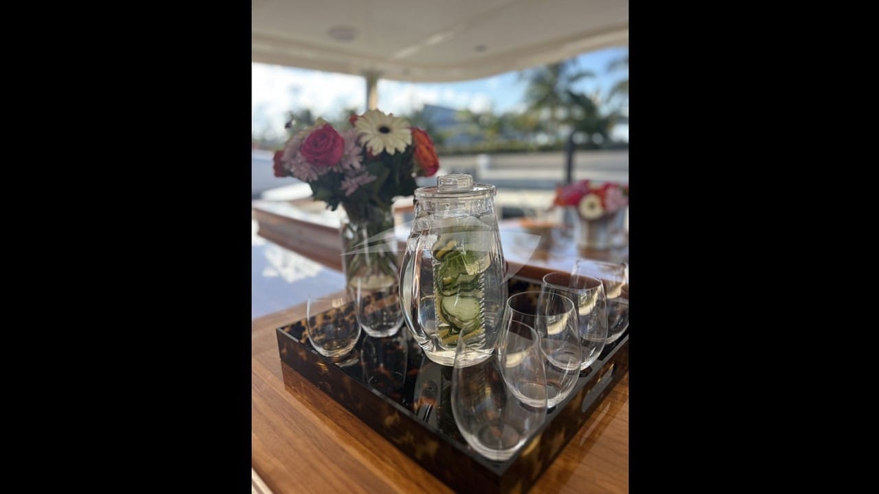 Amenities on board for the charter guests include BBQ, Ice maker, Stabilizers, Sun Deck, Swim platform, TV all cabins, TV saloon, Walkaround Bridge, Water maker and Wi-Fi.