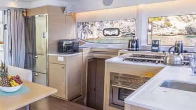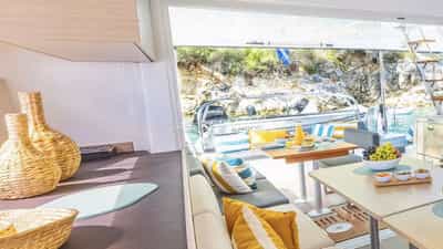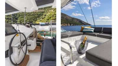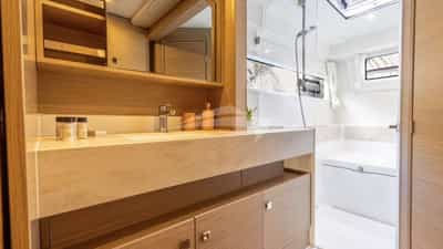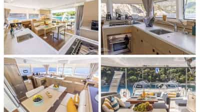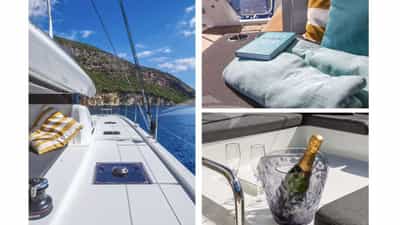 Amenities on board for the charter guests include Air Conditioning, Outdoor shower, Indoor audio system, TV saloon and Wi-Fi.